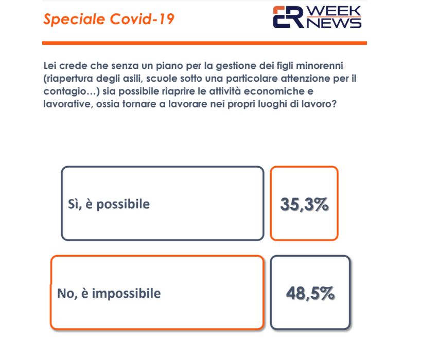 Per quanto riguarda la riapertura graduale delle attivita’, per quasi 1 italiano su 2 risulta impossibile tornare al lavoro senza prevedere anche un piano per la gestione dei figli minorenni, come la riapertura degli asili e delle scuole, il tutto seguendo particolari regole per evitare nuovi contagi.