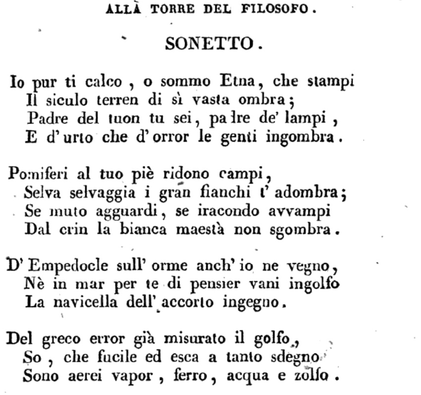 di Salvatore Tricomi – “Monte ignivomo Etna, strato vulcano aspite. Bicipite, cratere NE 3323 metri, cratere SE 3357 metri, (di continuo variabili). Condotti magmatici a struttura dendritica che porta alla formazione di crateri avventizi ed eruzioni a rift. Didimo a matrioska con il Mongibello. A 2920 metri sorgeva la torre del filosofo, abitata da Empedocle-medico, politico e filosofo, dove si forgiava negli studi di vulcanologia.