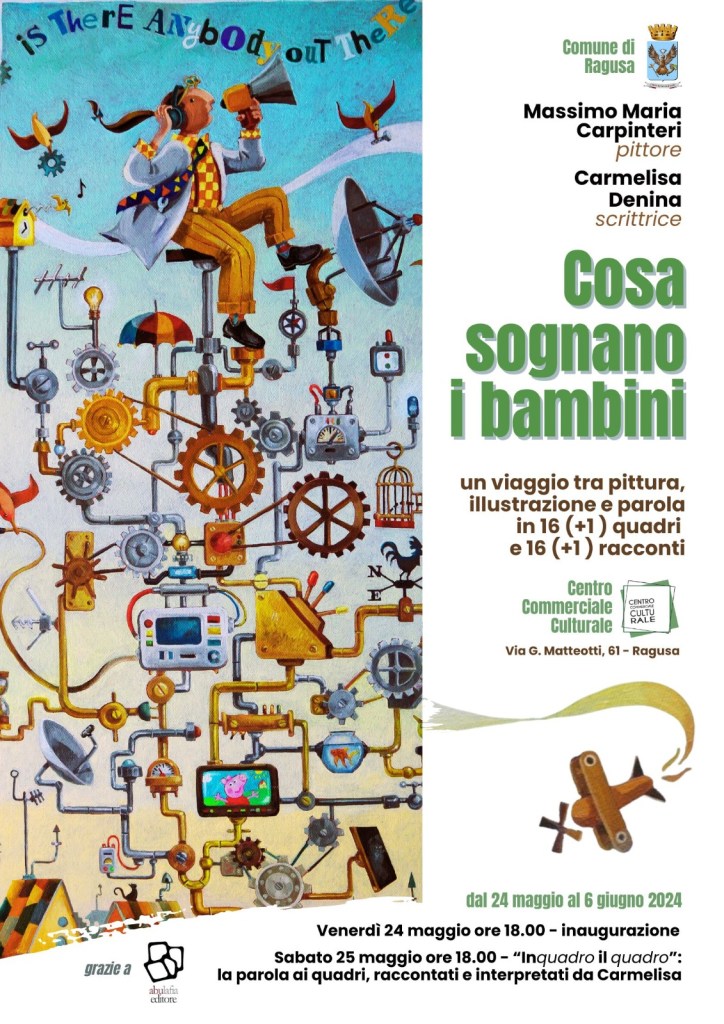 Un viaggio fra pittura, illustrazione e parola, dal 24 maggio al 6 giugno al Centro commerciale Culturale di Ragusa, è l’evento mostra nato dall’idea di due docenti del capoluogo che volevano creare un’occasione culturale, contenitore di emozioni. Anche se il titolo di questa iniziativa “Cosa sognano i bambini”, fa pensare che sia riservata specialmente ai più piccoli, in realtà la mostra dei due insegnanti artisti è il frutto delle loro passioni, e quindi coinvolge tutti, piccoli e adulti animati da passioni. L’amore per la pittura è il motore dei diciassette quadri che saranno esposti nella struttura di via Giacomo Matteotti, creati da Massimo Maria Carpinteri, pittore e docente di educazione artistica e l’amore per la scrittura della docente di spagnolo e scrittrice Carmelisa Denina, ha forgiato le parole dei diciassette racconti che accompagnano in dolce fusione sinestetica le opere pittoriche del collega.