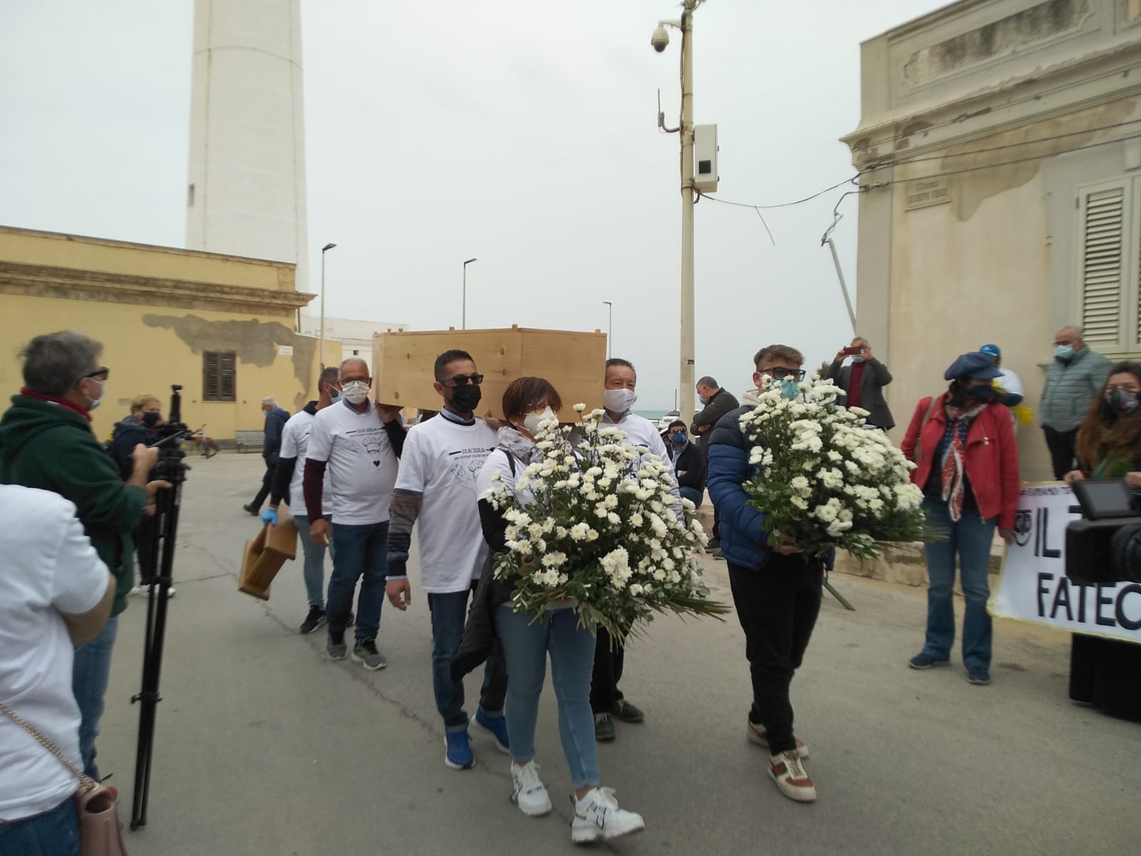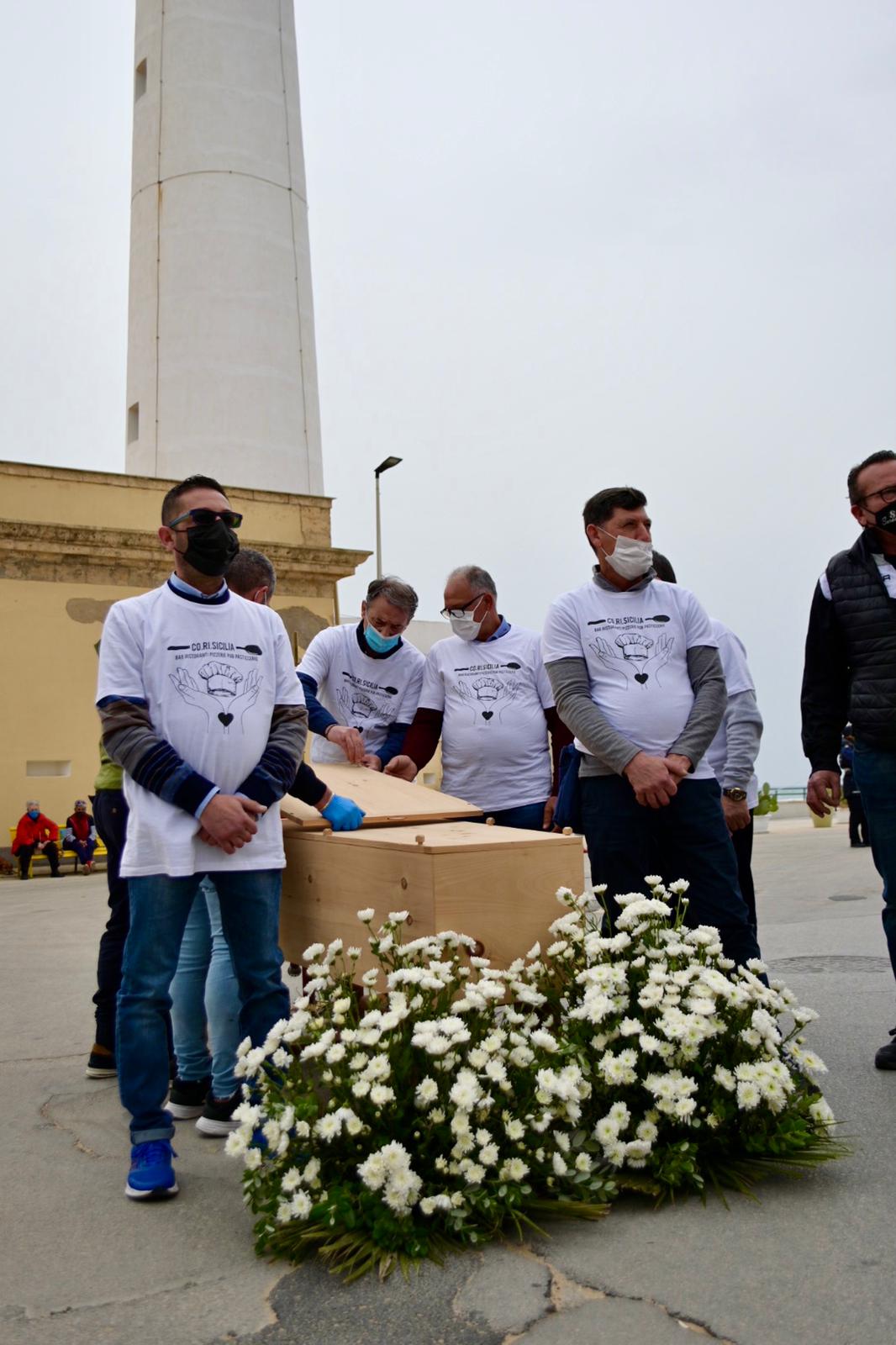 Hanno aderito anche numerosi operatori di altre categorie che soffrono a causa della pandemia: le agenzie di viaggio, gli operatori turistici, gli albergatori, i titolari di B&B, di camping, le palestre, i fiorai, i parrucchieri, i tassisti ed NCC, gli operatori dell’intrattenimento e dell’animazione, le agenzie e gli operatori del wedding, le guide turistiche, le imprese di pulizia, le lavanderie industriali. Qualcuno ha portato i letti, altri le tende da campeggio, o hanno esposto un manichino con abito da sposa, un tavolo apparecchiato. La compagnia teatrale G.o.d.o.t., che ha aderito all’iniziativa, ha mostrato le sedie rivolte verso terra, simbolo dei teatri chiusi. Tutti hanno gettato simbolicamente le loro “licenze” in una bara allestita in piazza Faro. Subito dopo, un corteo con la bara portata a spalla dai ristoratori, si è mosso verso la “casa di Montalbano”, seguita da tutti i presenti. Dal balcone della casa hanno portato la voce della protesta il presidente di Co.Ri.Sicilia, Raffaele Fiaccavento, Tania Corallo, il sindaco di Santa Croce Camerina, Giovanni Barone, i parlamentari regionali Nello Dipasquale, Stefania Campo e Orazio Ragusa.