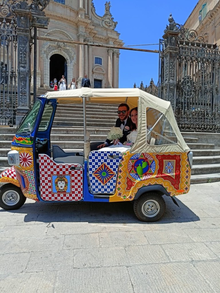 Ma a rendere unico il giorno del “sì” è stato anche un dettaglio fuori dall’ordinario: l’uscita dalla chiesa, il Duomo di San Giorgio, è avvenuto poco dopo su Lapetta, una tipica Ape calessino reinterpretata in chiave elegante, rivestita con decori siciliani, che ha accompagnato gli sposi in un romantico tour tra i vicoli di Ibla e altri luoghi simbolo, tra scorci panoramici e scatti fotografici dal sapore d’altri tempi. Un tocco di folklore e originalità che sta già facendo tendenza, al punto che Lapetta è sempre più richiesta non solo per matrimoni, ma anche per tour personalizzati alla scoperta del Barocco.
