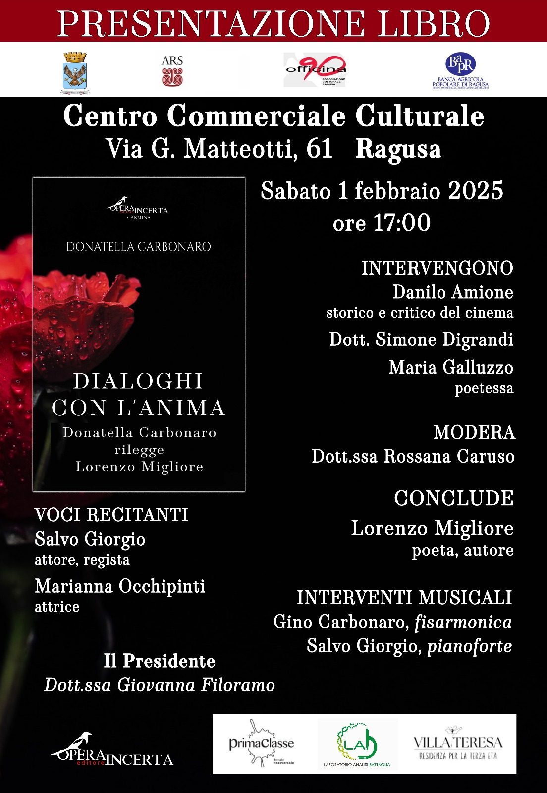 Sabato 1 febbraio 2025, alle ore 17:00, presso il Centro Commerciale Culturale di Via G. Matteotti 61 a Ragusa, si terrà la presentazione del libro *Dialoghi con l’anima*. L’opera, curata da Donatella Carbonaro, rilegge i versi del poeta Lorenzo Migliore.