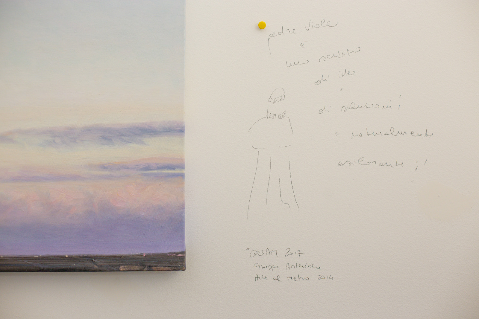 Per questa festa Antonio Sarnari ha curato un percorso molto aderente al suo lavoro di questi dieci anni, ed ha allestito una mostra di una ventina di artisti, che rappresentano ciascuna/o più eventi e progetti curati dallo studio, sia passati che futuri. Ad esempio troviamo la grande tela monumentale di Giuseppe Puglisi (250×350 cm), scelta a ricordare i tanti progetti dedicati al Gruppo di Scicli, almeno una decina, tra cui la presentazione del gruppo a New York nel 2012; oppure l’opera di Federico Severino, che porta l’annotazione “next opening Ottobre 2017”, oppure Tamara Marino “Quam Autunno 2019”, perché si tratta dei progetti già in programma, come a dire che più che fermarsi a pensare al passato, o essere autocelebrativi, lo studio è particolarmente attivo e a lavoro per il futuro!