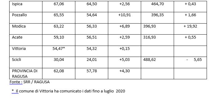 Preoccupano a tale proposito i comuni di Monterosso Almo, Giarratana e Modica con aumenti compresi tra il 15 e il 20% rispetto al 2019. In questo momento critico un ruolo centrale dovrebbe essere assunto dalla SRR che non può limitarsi a gestire gli impianti, attività che peraltro sta svolgendo egregiamente nonostante la fortissima carenza di personale tecnico. La SRR deve assumere il ruolo che gli è stato assegnato dalla legge 9/2010. Dovrebbe occuparsi anche di formare i tecnici comunali carenti in quantità e qualità, di uniformare e potenziare l’attività di comunicazione in tutta la provincia per un miglioramento della qualità della RD e coordinare i controlli ambientali in riferimento ai troppi rifiuti abbandonati in ambito extraurbano.