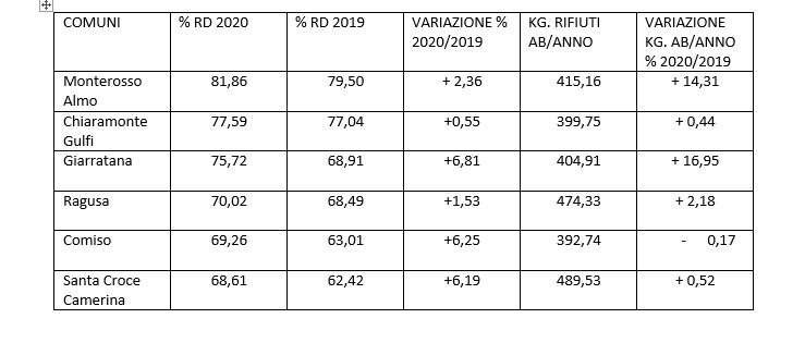 La recente crisi nella raccolta dei rifiuti indifferenziati del mese di gennaio, dovuta al ritardato rilascio da parte della Regione Sicilia dell’Autorizzazione Integrata Ambientale dell’impianto di Trattamento Meccanico Biologico di Cava dei Modicani a Ragusa, avrebbe avuto ben altre conseguenze se la provincia di Ragusa non avesse raggiunto e superato nel 2020 il 62% di RD. A dimostrarlo il fatto che i comuni che hanno sofferto di più sono stati Vittoria e Scicli ultimi per RD in Provincia rispettivamente con il 54,47% e con il 30,04%. Tutti gli altri, chi più chi meno, hanno retto. Sicuramente i comuni montani che viaggiano su risultati di eccellenza fra il 75 e l’82% e i grossi centri come Ragusa e Comiso che raggiungono risultati intorno al 70%.