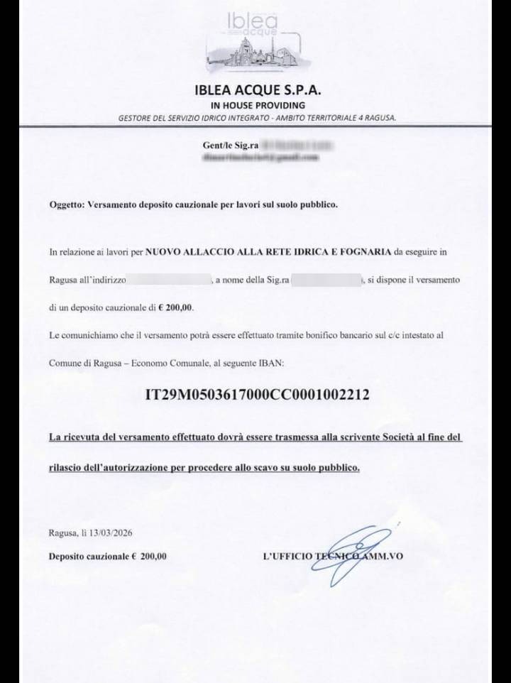 Una portavoce della società ha contattato anche la nostra redazione per spiegare che per realizzare l’allaccio alla rete idrica sarà necessario intervenire sulla tubazione con due passaggi distinti: una parte della condotta dovrà attraversare una zona privata e un’altra parte dovrà invece passare su suolo pubblico. Proprio per questo motivo, sempre nella giornata di ieri, Iblea Acque ha disposto il versamento di un deposito cauzionale di 200 euro, necessario per ottenere l’autorizzazione allo scavo sul suolo pubblico. Una volta completati questi adempimenti burocratici e tecnici, la società potrà procedere con l’intervento definitivo di collegamento dell’abitazione alla rete idrica.