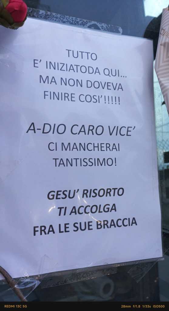 Sulla sua bara sono stati posizionati la maglia rossa che Vicè indossava come tutti i portatori nel giorno di pasqua, insieme al gagliardetto e al fazzoletto rosso. Ma c’è anche un fazzolettone azzurro, posizionato dai “portatori” del secondo simulacro della festa di Pasqua, quello di Gesù Risorto. La festa di Pasqua si celebrerà esattamente tra un anno, il 5 aprile e quel giorno sarà anche il giorno del suo onomastico. Per la prima volta Vicè non ci sarà.