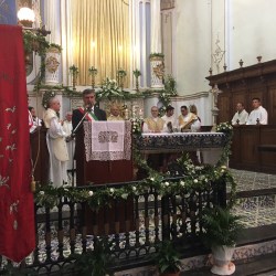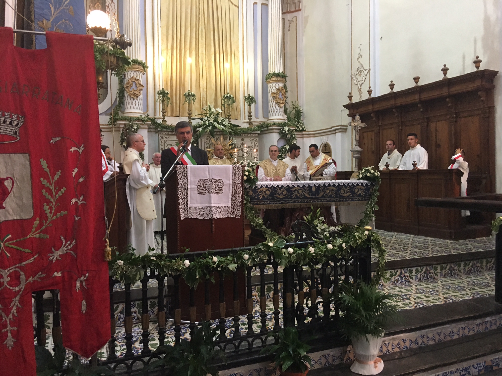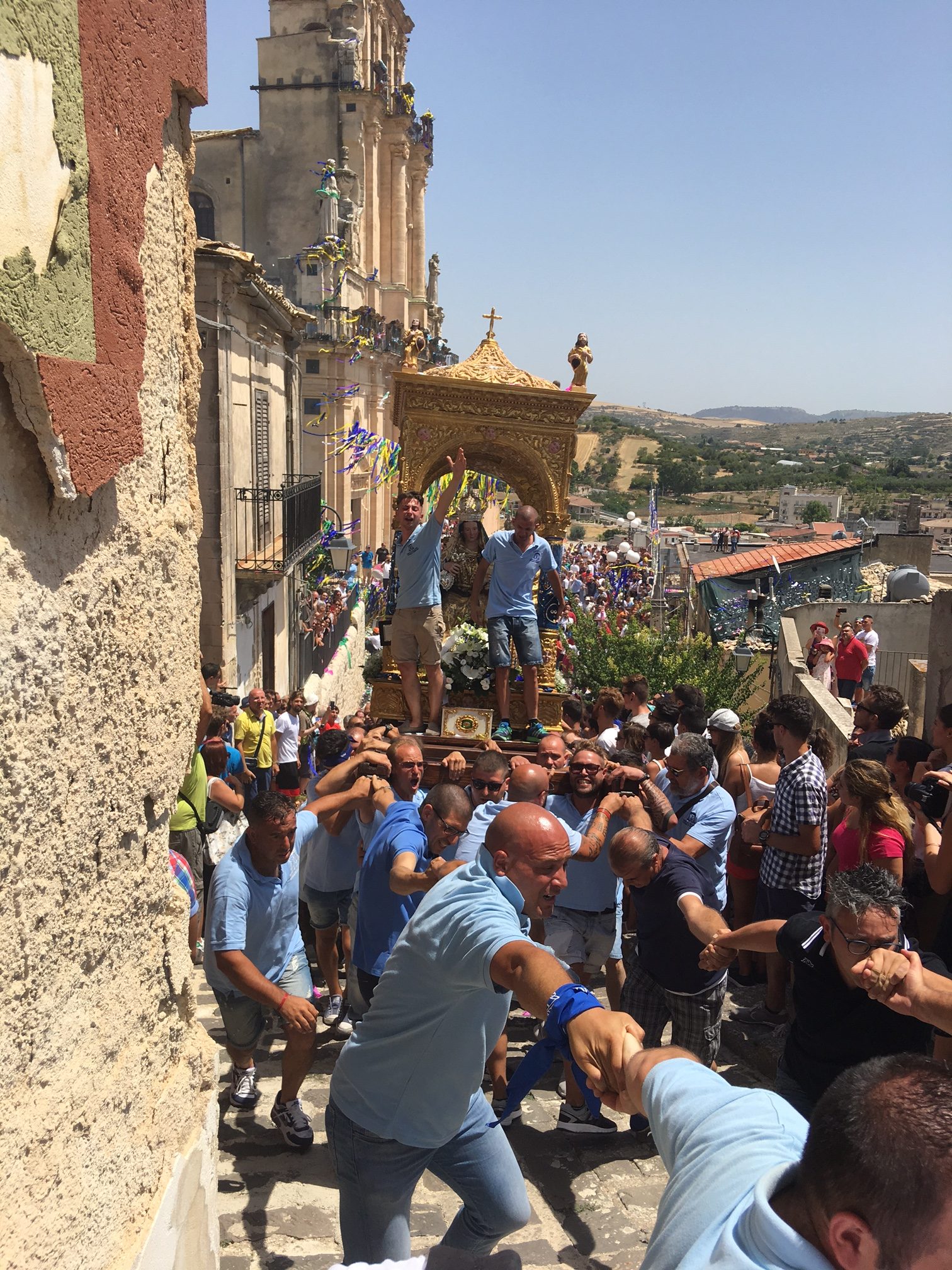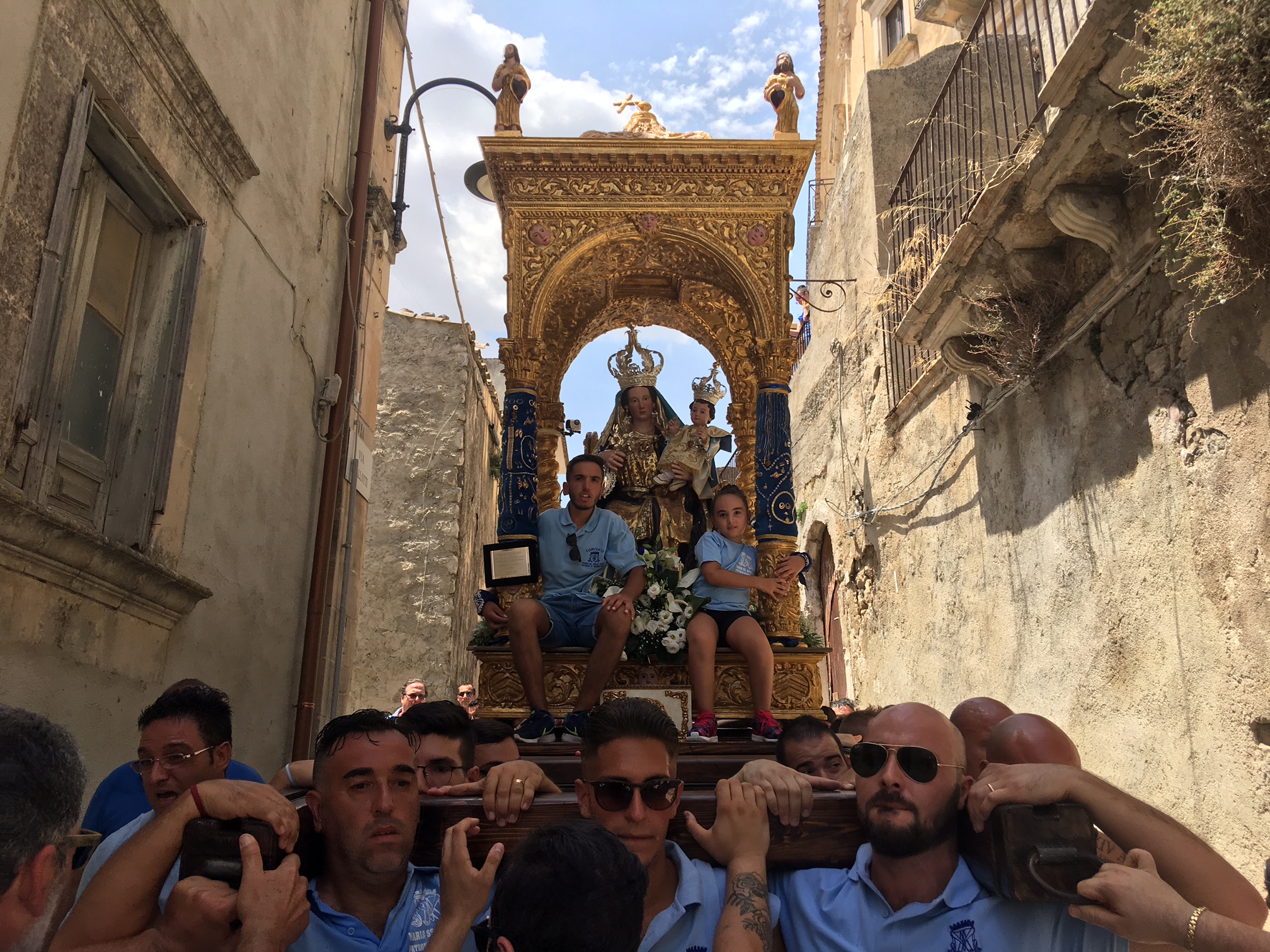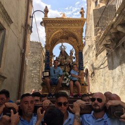 GIARRATANA – Emozioni fantastiche. E uno straordinario sussulto al cuore. Per quello che, come ogni anno, si rivela alla stregua di un momento magico carico di significati religiosi. La “Sciuta” della Madonna della neve, Patrona di Giarratana, si è consumata anche quest’anno nella tradizionale data del 5 agosto, oggi cioè, poco dopo mezzogiorno, tra il fragore dei fuochi d’artificio e lo sparo dei cosiddetti “’nzaireddi”, più colorati e suggestivi che mai. Un mix che ha reso la cerimonia magnifica. E non a caso erano presenti, oltre ai fedeli e ai devoti, anche numerosi turisti. I portatori, come se fosse una sola a mano a guidare questa moltitudine di persone, hanno fatto uscire il simulacro della Patrona dalla basilica di Sant’Antonio Abate, dopo l’incedere assordante dei tamburi di Giarratana. Un caleidoscopio di colori ha animato il prospetto dell’edificio di culto. Tra gli applausi. Questa fase della festa è stata preparata con la massima attenzione. Accolti dal tripudio dei numerosi presenti, i portatori hanno atteso che si completasse il rito della “Sciuta” prima di avviare la processione per le vie del centro storico. Cominciando quasi di corsa nel breve tratto in salita che conduce nell’antico centro storico di Giarratana. Per poi portare il simulacro nella chiesa del Patrono, San Bartolomeo. Tutti momenti molto apprezzati dai fedeli. A guidare la processione il parroco, don Mariusz Starczewski, alla presenza del vicario, Giovanni Piccione. Quello di oggi è un rito che si ripete anno dopo anno con la stessa intensità per perpetuare una tradizione che affonda le proprie radici nella notte dei tempi. Una devozione totale quella fatta registrare dai giarratanesi che hanno assistito, prima della “Sciuta”, alla solenne concelebrazione eucaristica presieduta dal vicario generale della diocesi, don Roberto Asta. Erano presenti le massime autorità civili e militari cittadine, a cominciare dal sindaco Bartolo Giaquinta. A fine celebrazione è stata consegnata ai devoti portatori una medaglia mariana. Il primo cittadino, inoltre, alla fine della celebrazione, ha fatto atto di consacrazione della città alla Santa Patrona. “Questi sono momenti significativi – ha sottolineato il vicario generale – perché costituiscono l’identità di un polo. A maggior ragione se si celebra Maria, la donna dell’ascolto, della preghiera, dell’accoglienza, della carità e del sorriso. Maria è modello della Chiesa e di ogni credente cristiano”. Intorno alle 13, poi, c’è stato il rientro della processione in chiesa Madre con omaggio floreale a San Giuseppe. Ma la festa non è conclusa. Proseguirà anche oggi pomeriggio. Alle 16,30 ci sarà il giro per le vie cittadine da parte del corpo bandistico con l’esecuzione di marce sinfoniche in piazza. Alle 18, la sfilata lungo corso XX Settembre e corso Umberto I da parte dei tamburi di Giarratana. Alle 18,30 la tradizionale cena con la vendita all’asta dei doni offerti. Alle 20,30 la solenne celebrazione eucaristica presieduta da padre Joseph Muamba Bulobo. Alle 21,30, dalla chiesa Madre, la processione serale, alla presenza delle autorità civili e militari. Alle 23,30 nella basilica di Sant’Antonio Abate, il parroco consacrerà la parrocchia di Giarratana al Cuore Immacolato di Maria. Quindi, a seguire, il tradizionale rientro del simulacro portato a spalla e accompagnato dal canto del “Magnificat” contrassegnato da un artistico spettacolo di luci e fuochi sulla facciata della basilica a cura della ditta Fire Sud e della Basile service audio con l’Air cannon show. Ci sarà quindi l’ingresso della processione e la riposizione del simulacro sull’altare maggiore. Ultimo atto, a mezzanotte e mezza, i fuochi d’artificio, nella zona delle case popolari della Santuzza. E’ previsto uno spettacolare intrattenimento pirotecnico a cura della rinomata e premiata ditta Cav. Gennaro e Luigi Di Matteo da Sant’Antimo (Napoli).