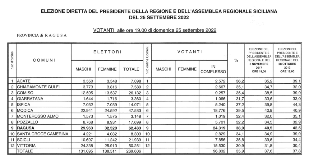 Per quanto riguarda il dato riferito alle elezioni Regionali, il dato complessivo, alle ore 19, è del 35%, due punti in meno rispetto alle ultime elezioni nel rilevamento della stessa ora. La prossima e ultima rilevazione è alle ore 23. A Ragusa continuano a registrarsi problemi ai seggi per molti cittadini è stato non facile, se non impossibile votare, come abbiamo già spiegato nei nostri articoli precedenti. Ecco intanto i dati Comune per Comune.