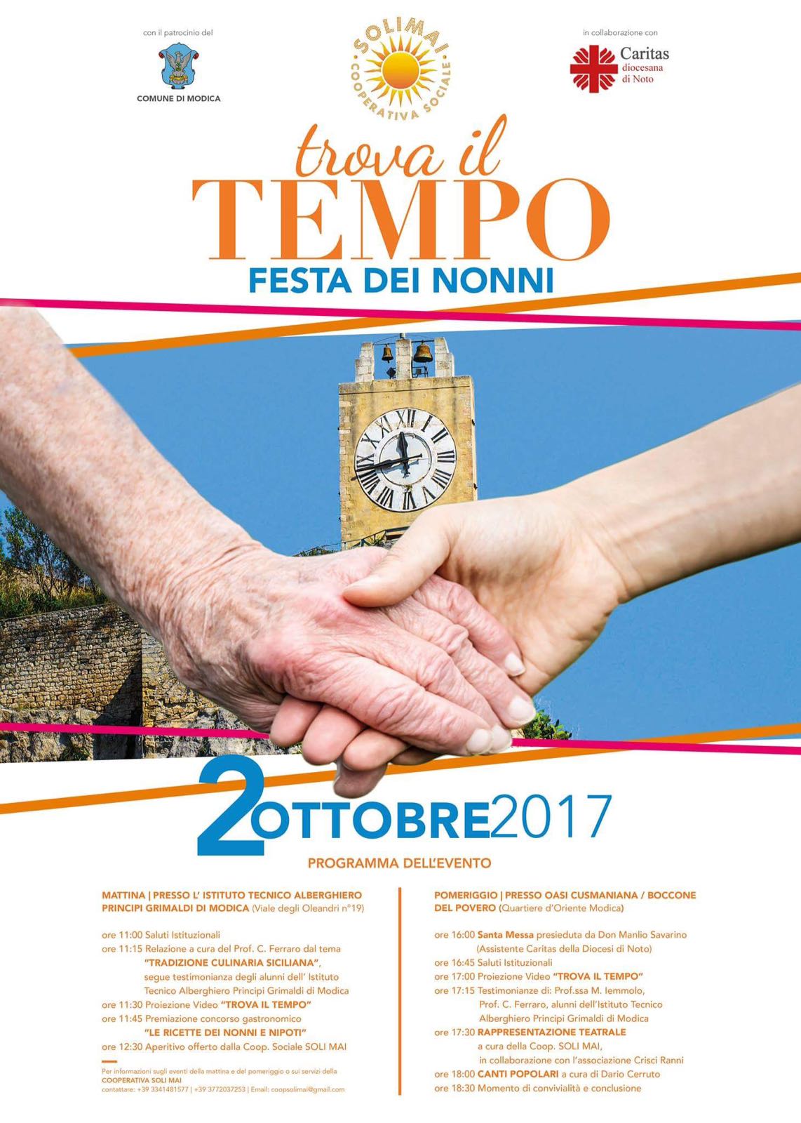 La giornata dei nonni è diventata negli anni una festa sempre più diffusa. In tutto il mondo si organizzano eventi, incontri , festeggiamenti per dare valore alla figura dei nonni. Per noi, della cooperativa SoliMai, della Caritas diocesana di Noto e Fondazione Madre Teresa di Calcutta è diventato, invece, un continuare a prenderci cura di piccoli e anziani, un’occasione d’incontro e di relazione con coloro che rappresentano i poli della vita, spesso dimenticati, in una società che emargina gli anziani e abbandona i bambini. Gli anziani sono parte essenziale della comunità cristiana e della società in quanto rappresentano le radici e la memoria di un popolo. Gli anziani continuano a scuoterci e a interrogarci, al fine di dare il giusto valore alle persone, alle cose, al tempo; un tempo che trova il suo più alto compimento nella condivisione. Quest’anno abbiamo voluto celebrare questa festa, infatti, coinvolgendo i ragazzi dell’Istituto Alberghiero, i loro nonni e i nostri amici del Boccone del Povero, che rappresentano idealmente i nonni della città di Modica, e mettendo insieme alcuni ingredienti importanti, come la relazione, il cibo e la tavola che tutti unisce. Facendo festa oggi insieme, ma anche durante l’intero anno in cui i ragazzi hanno lavorato in classe e a casa con i loro nonni, vogliamo dare valore alle nostre tradizioni, a partire da quelle culinarie tipiche del nostro territori. Trova il tempo è il titolo che abbiamo pensato per la realizzazione di questo evento che si terrà nella mattinata di lunedì 2 ottobre presso l’Istituto Alberghiero con il concorso “Le ricette dai nonni ai nipoti”, aperto alle ore 11.00 con il saluto del Sindaco e continuerà con la presentazione dei lavori che gli alunni hanno prodotto durante l’a.s. 2016-2017. Il pomeriggio vedrà protagonista l’Oasi Cusmaniana – Boccone del povero, dove dalle 16.00 alle 18.00 si terrà uno sketch, a cura della Cooperativa SoliMai e dei ragazzini di Crisci ranni. In questa giornata rifletteremo anche sul rapporto tra nonni e nipoti, tra vecchie e nuove generazioni nel nostro territorio, attraverso la visione di brevi filmati e gli interventi di quanti hanno pensato e appoggiato questo progetto.