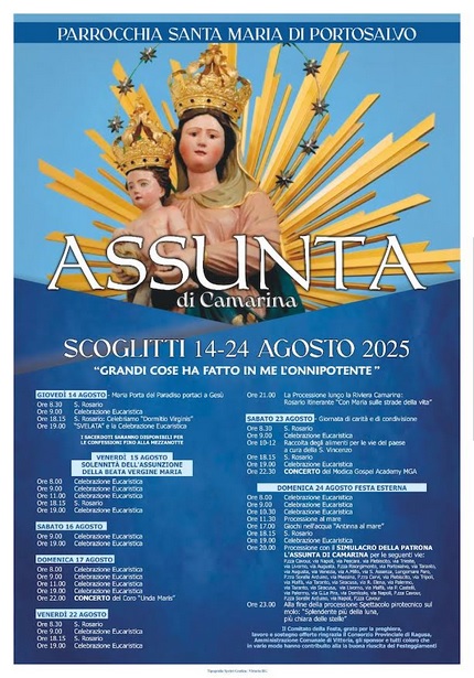 Festa della Madonna Assunta di Camarina a Scoglitti. La festa, che si è fusa con quella in onore di Santa Maria di Portosalvo, patrona della frazione, avrà il suo clou nella giornata di oggi, con la solenne “Sciuta” del simulacro e la processione per le vie della frazione.