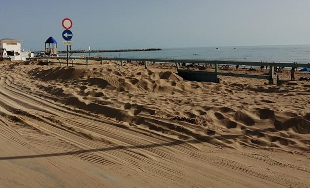 Le vie d’accesso al lungomare e alla spiaggia di Scoglitti completamente invase dalla sabbia. Un problema che si ripropone ogni anno.