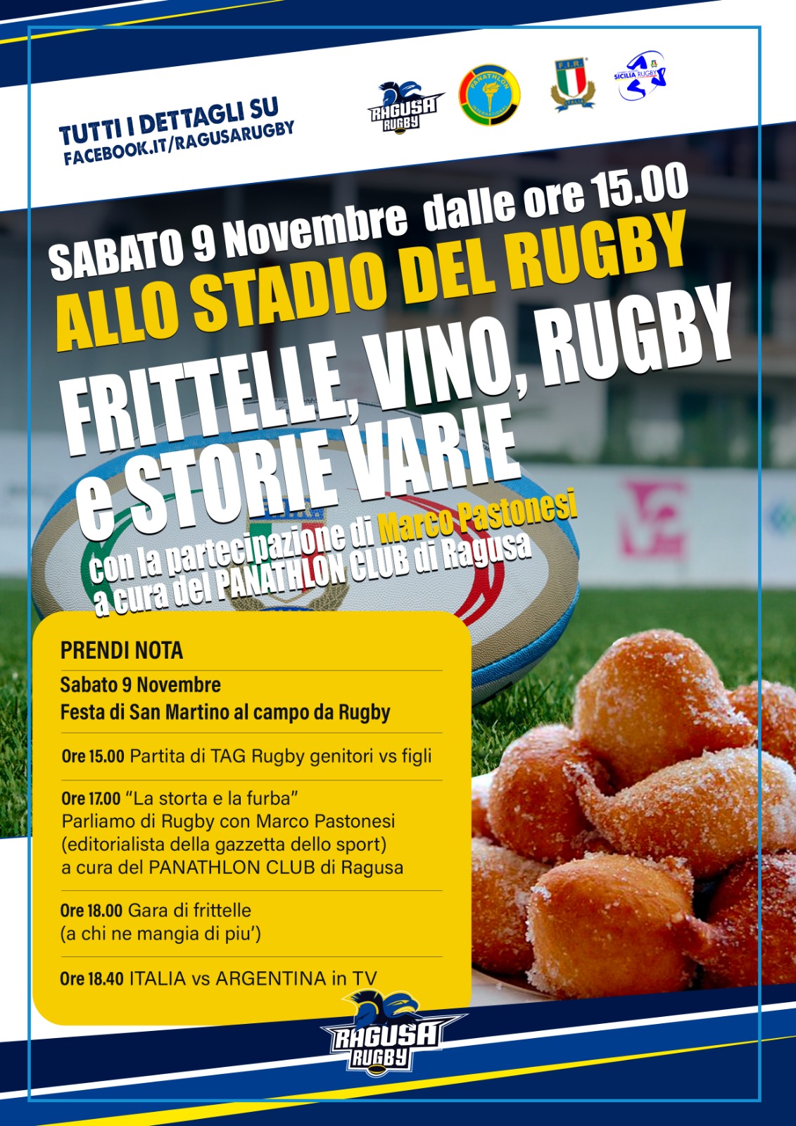Una giornata all’insegna del rugby, della tradizione e della convivialità. È “Frittelle, Vino, Rugby e Storie Varie”, in programma sabato, a partire dalle 15, allo Stadio del Rugby di via Forlanini. La giornata è organizzata dal Ragusa Rugby, che, grazie all’invito del Panathlon Club Ragusa, ospita l’intervento del giornalista Marco Pastonesi, noto per il suo legame con il mondo del rugby. Pastonesi è infatti in provincia su invito del Panatlhon con l’evento “w la fuga” che vedrà un momento di confronto il giorno prima al ristorante il baglio e poi giorno 11 novembre un incontro con le scuole.