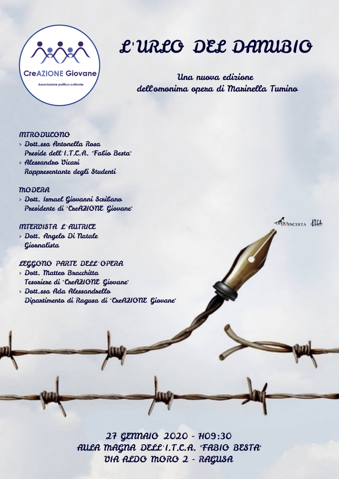 Lunedì 27 gennio, alle 09:30, l’Associazione politco-culturale “CreAZIONE Giovane” presenterà “L’urlo del Danubio”, libro dell’autrice locale Marinella Tumino. Giunto alla terza edizione, l’opera presenta un nuovo capitolo dedicato al campo di concentramento di Ferramonti di Tarsia (Calabria). Presso l’Aula Magna dell’I.T.C.A. “Fabio Besta” di Ragusa, in Via Aldo Moro 2, modererà l’incontro il Dott. Ismael Giovanni Scribano (Presidente di “CreAZIONE Giovane”) mentre l’autrice sarà intervistata dal giornalista Angelo Di Natale.