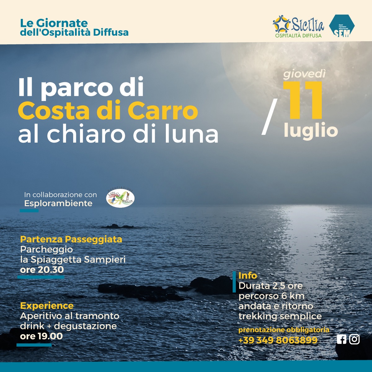 Pronti per l’escursione in notturna al parco extraurbano di Costa di Carro? Il Parco di Costa di Carro si sviluppa tra le borgate di Sampieri e Cava D’aliga, nel tratto di costa più selvaggio e meno antropizzato del territorio di Scicli. Durante la passeggiata al chiaro di luna, accompagnati dall’associazione Esplorambiente, saranno esplorati gli aspetti geologici, naturalistici e storici, nonchè archeologici ed etno-antropologici, di questo parco istituito nel 2002. La vegetazione spontanea della macchia mediterranea farà da cornice agli splendidi paesaggi che si apriranno ai visitatori nei diversi tratti di costa: dalla spiaggia alla scogliera, prima bassa e poi più alta a strapiombo sul mare. Il tutto sarà reso ancora più suggestivo dal chiarore della luna che illuminerà il percorso. Appuntamento Giovedì 11 Luglio a La Spiaggetta di Sampieri, dalle 19,00 in poi per l’aperitivo e partenza alle 20,30 per la passeggiata. Si raccomandano scarpe chiuse, abbigliamento comodo, torcia e acqua. Prenotazione Obbligatoria. L’evento si inserisce nelle Giornate dell’Ospitalità Diffusa, un fitto calendario di incontri ed eventi estivi ideati da Sicilia Ospitalità Diffusa, la rete di accoglienza territoriale unconventional, tra le destinazioni più suggestive degli Iblei, alla scoperta della Sicilia del sud-est, barocca, rupestre e marittima. Il programma estivo delle Giornate dell’Ospitalità Diffusa a Sampieri proseguirà con altri appuntamenti nei mesi di Agosto e Settembre: per i vicoli del centro di Sampieri (8 Agosto) e alla Fornace Penna (22 Agosto e 5 Settembre).