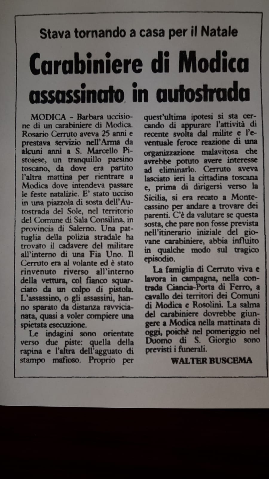 Brutalmente assassinato nel Dicembre del 1985 di ritorno in Sicilia, all’altezza di Sala Consilina, la storia che vi raccontiamo è quella del carabiniere modicano Rosario Cerruto.
