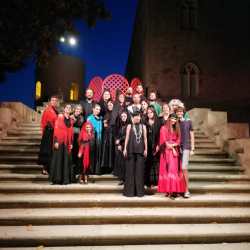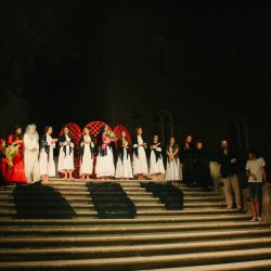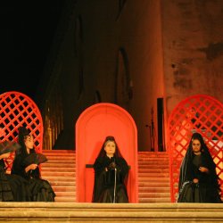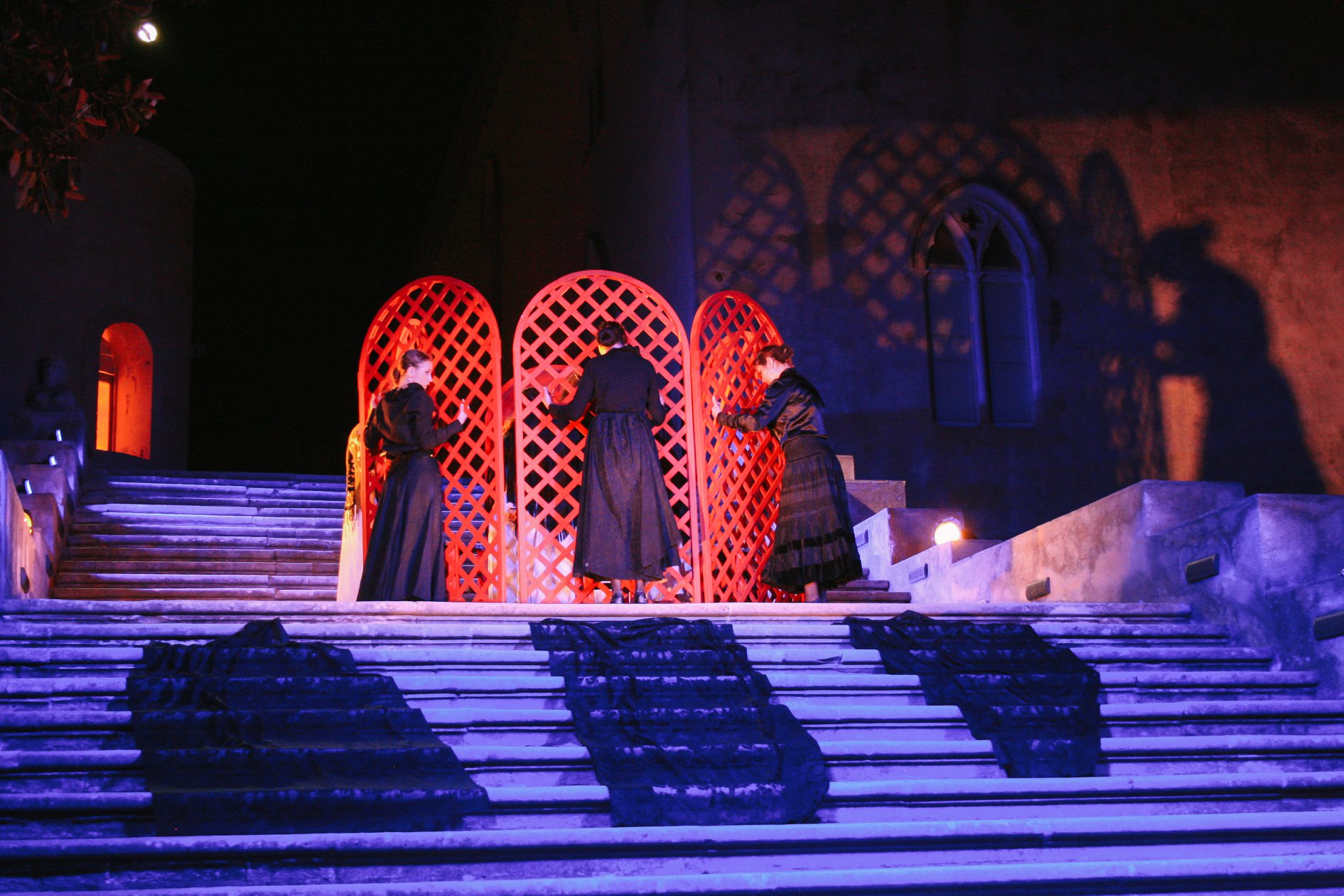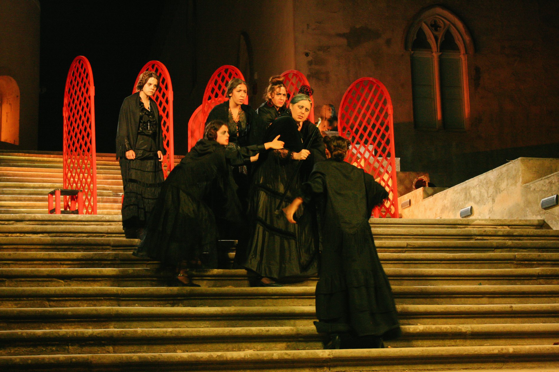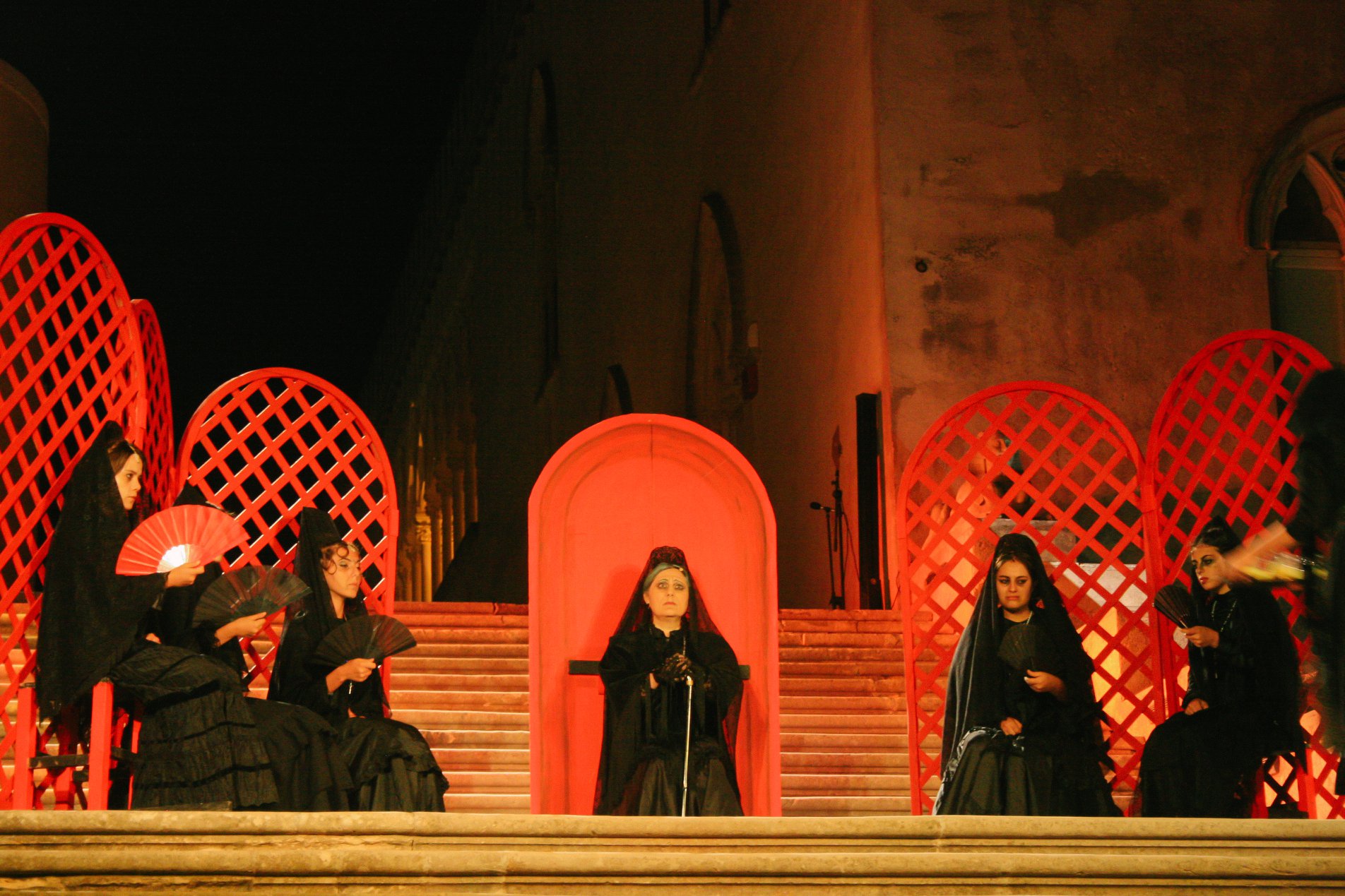 Accanto alla maestria dell’attrice principale, che ha curato con dedizione anche i testi e il riadattamento, hanno saputo incarnare perfettamente i vari personaggi anche tutte le altre giovani attrici della compagnia, che sorprendono ed emozionano per la capacità interpretativa e per l’immedesimazione, complici di una regia che ha voluto esaltare non soltanto i singoli ma l’intero gruppo di interpreti, immaginando scene e ambienti che si creano proprio dinnanzi agli occhi dei numerosi spettatori, molti dei quali turisti. La rappresentazione dell’opera drammaturgica di Garcìa Lorca, che indaga sul ruolo della donna e la sottomissione subita nella Spagna rurale degli anni trenta, ha impegnato tutti gli attori presenti in scena capaci ciascuno di offrire un entusiasmante contributo insieme a costumi ben ricercati e alle luci di Andrea Iozzia che hanno esaltato la monumentalità degli spazi. Il testo ha toni drammatici che la regia di Bonaccorso ha ben esaltato approfittando anche della suggestione della luna rossa di qualche giorno fa ma anche del movimento scenico con gli elementi che creano una gabbia che è poi la casa di Bernarda Alba, una casa da dove le figlie cercano di fuggire ma dove l’unico modo per farlo è morire.