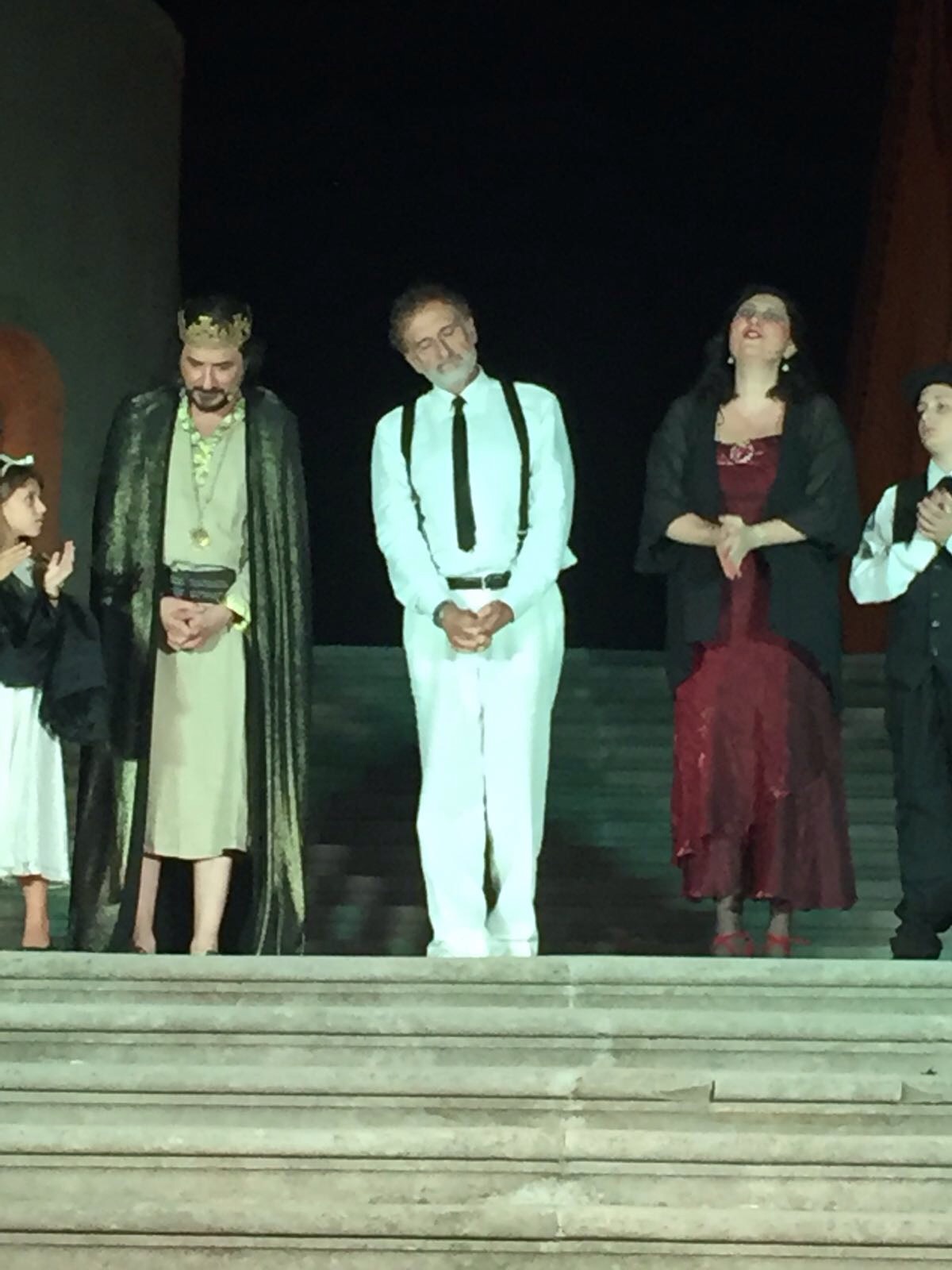 “Pirandelliana”, con la regia di Bonaccorso, particolarmente apprezzata per le idee di grande impatto, costumi e adattamento testi di Bisegna, ha regalato un excursus tra le opere più belle scritte dal premio Nobel per la letteratura. Sul palco, insieme agli attori della Compagnia, uno straordinario Massimo Venturiello, amico ormai del gruppo ragusano. “Un attore straordinario, ma soprattutto una persona immensa – commenta Bonaccorso – che ha voluto essere con noi in questo intenso spettacolo nella meravigliosa cornice della gradinata del palco del maniero che ogni anno ci ispira e suscita tante emozioni”. Una stima ricambiata da Venturiello che a fine serata ha voluto ringraziare la Compagnia teatrale esaltandone la grande capacità formativa per gli allievi. “Ho conosciuto la Compagnia G.o.D.o.T. un anno e mezzo fa – commenta Venturiello– e sono ritornato con piacere, oltre che per l’affetto e la stima che nutro nei confronti di Federica e Vittorio, soprattutto per la passione che mettono nel loro lavoro. In Italia c’è proprio mancanza di interesse per il teatro che non fa tanti numeri in un’epoca spesso misurata attraverso essi. Il teatro soffre a livello di interesse da parte della nuova generazione che non ha lo stesso trasporto con cui invece ci siamo avvicinati noi tempo fa. Ecco, qui ho respirato di nuovo questa passione, perché il teatro non è considerato una cosa tra le tante che si fanno, ma è la cosa che riempie la vita di tutti loro. Per me è una boccata di ossigeno”.