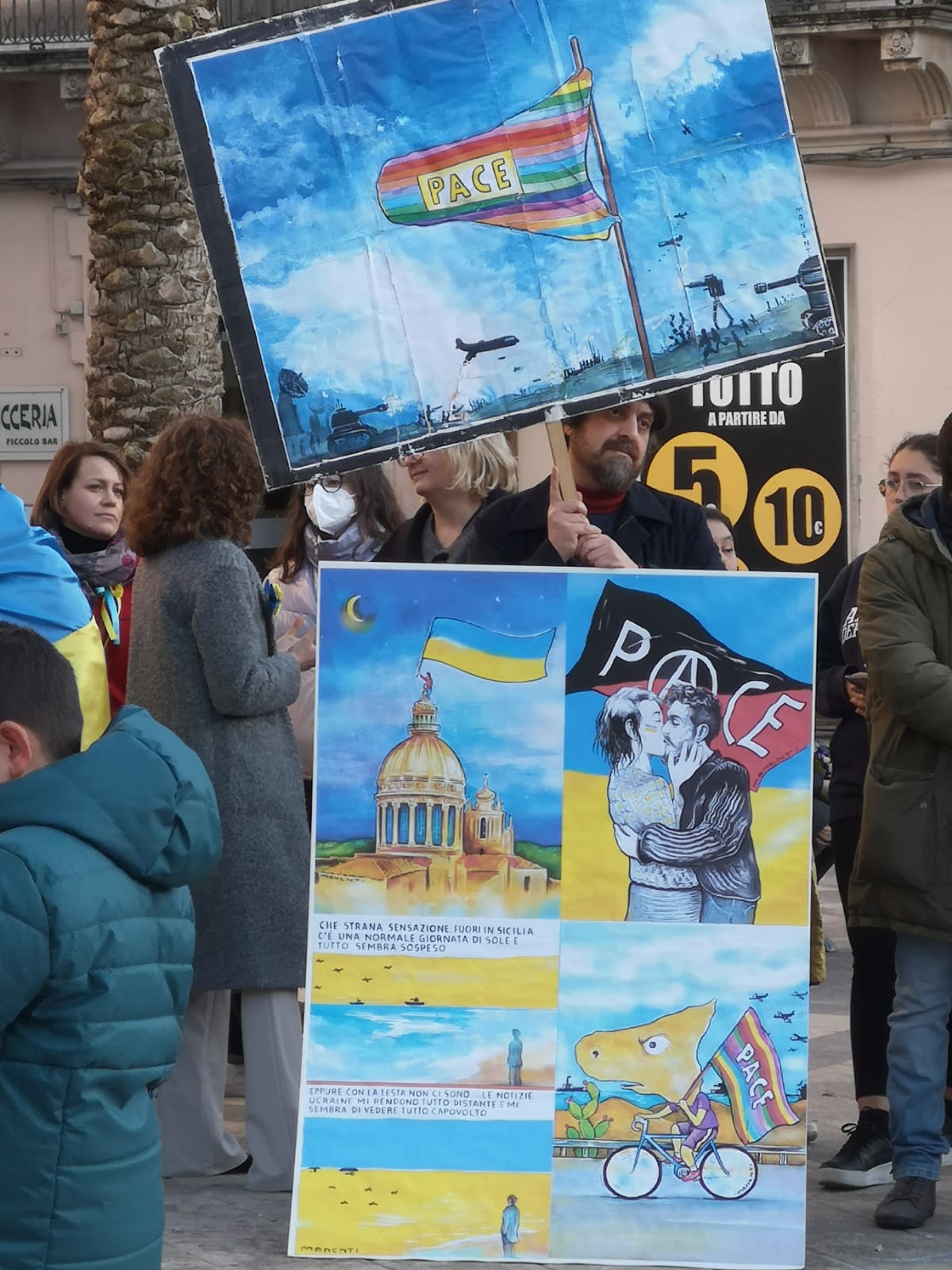 Si è tenuto ieri, a Modica, il sit in per manifestare contro ogni guerra, organizzato dal Comitato spontaneo per la pace e dal Collettivo di studenti La Macchia.   Una piazza viva, partecipe e colorata. Tanti i bambini e tanti soprattutto i rappresentanti delle associazioni cittadine che hanno dimostrato, con la loro presenza, il bisogno che questa città ha di incontrarsi, confrontarsi, riflettere sui temi che sono alla base del nostro vivere civile.  Il sit in si è articolato in vari momenti di alto valore simbolico: la lettura, da parte di studenti e cittadini, di brani celebri sulla pace e contro la guerra, da “Veglia” di Giuseppe Ungaretti a “Addio alle armi”.