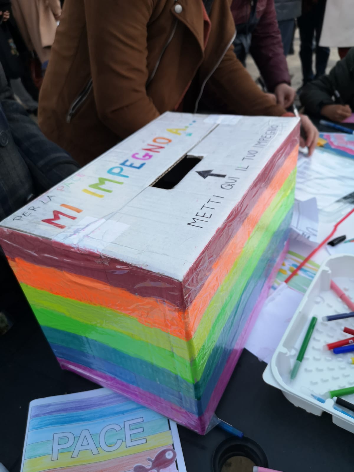 E ancora Brecht, Rigoni Stern, Liliana Segre, Rodari, l’articolo 11 della Costituzione italiana, Tiziano Terzani e brani tratti da Lettere dei condannati a morte della Resistenza.   Emozionante il NO nelle varie lingue del mondo pronunciato dalla voce di concittadini di altre nazionalità. Così come il girotondo dei bambini sulle note dell’omonima canzone di De André che ha coinvolto tutti i presenti in un grandissimo cerchio collettivo, simbolo di unità e partecipazione.   Poi il “filo della pace”, tanti gomitoli di lana colorata che hanno simbolicamente unito tutti i partecipanti nel segno della pace, il lancio dei palloncini con i colori della bandiera della pace, e la cassetta degli impegni, dove ognuno ha potuto inserire il proprio impegno concreto. «Perché la pace si costruisce ogni giorno, è il frutto di una costruzione personale e collettiva quotidiana e ognuno di noi può impegnarsi a fare qualcosa» spiegano gli organizzatori.  Presenti anche i rappresentanti della comunità ucraina che in questo momento sta soffrendo il dramma della guerra.