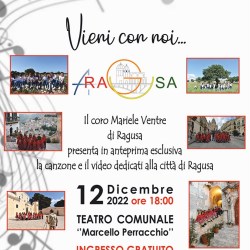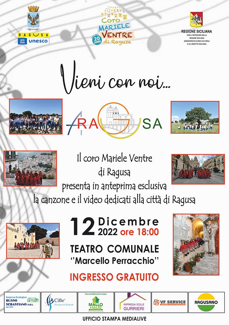 RAGUSA – E’ tutto pronto per il lancio del progetto di promozione territoriale immaginato dal Coro Mariele Ventre di Ragusa, diretto da Giovanna Guastella con la realizzazione di un video che racconta Ragusa e le sue bellezze seguendo il ritmo e le note di una bellissima canzone che ne esalta le peculiarità, naturalmente cantata dai piccoli coristi. “A Ragusa”, questo il titolo del brano scritto da Alessandro Visintainer e Valeria Bolani, con la consulenza di Adriana Vernuccio e di Giovanna Guastella è infatti divenuto un videoclip con la regia di Giovanni Corallo e sarà presentato ufficialmente questo lunedì 12 dicembre alle ore 18 al Teatro Marcello Perracchio di Ragusa.