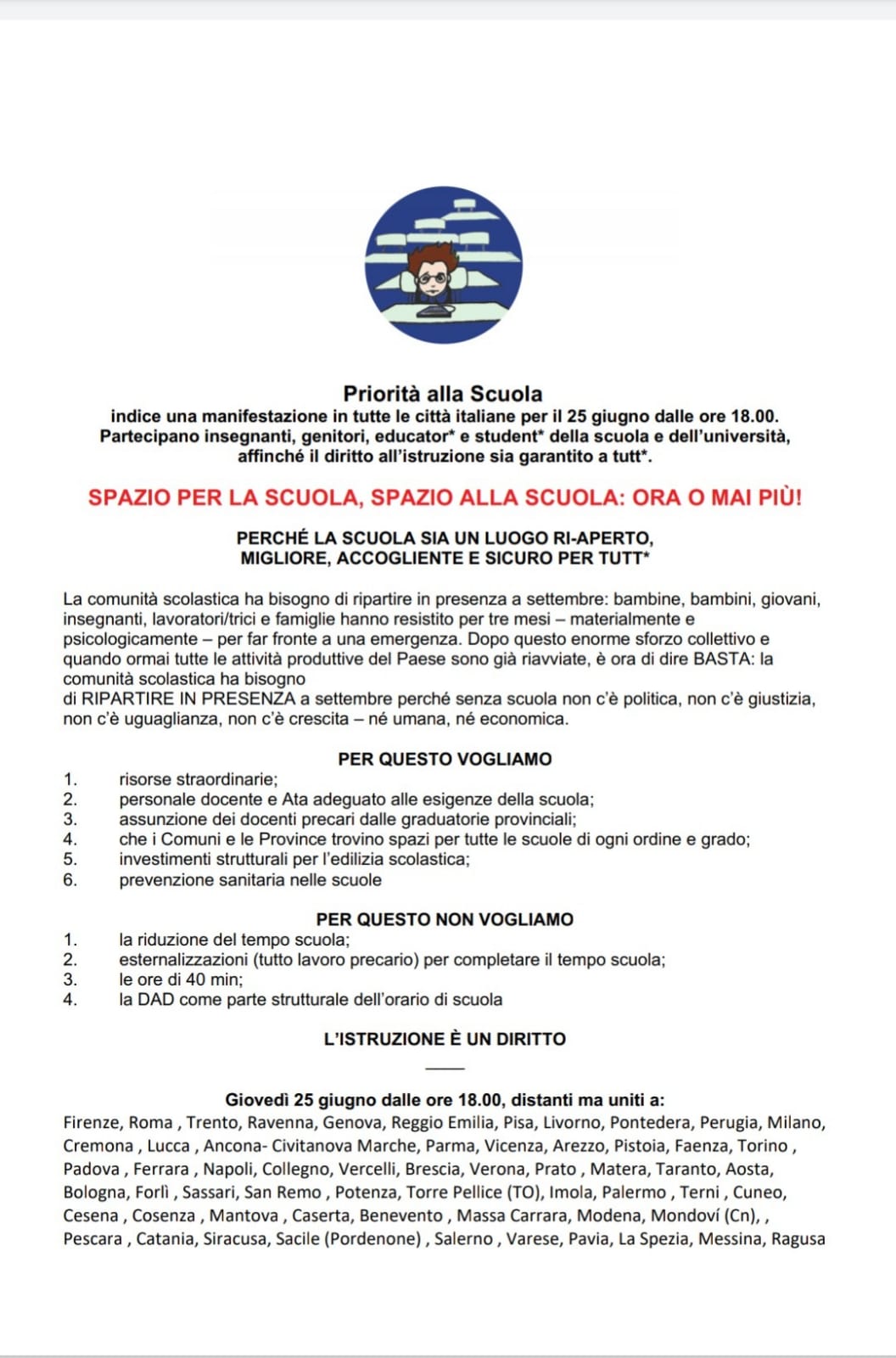 Il futuro della scuola: giovedì 25 giugno anche Ragusa partecipa all’iniziativa promossa dal comitato Priorità alla Scuola che coinvolgerà diverse città d’Italia.