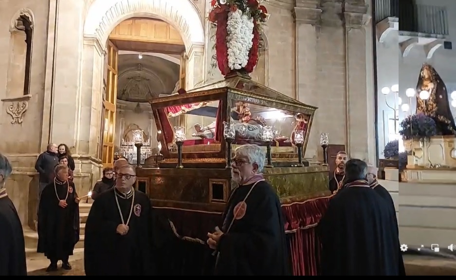 La sera, dopo la conclusione della rappresentazione il simulacro del Cristo è stato posto in un’urna a vetri e riportato in basilica, insieme a quello di Maria Addolorata. Una curiosità: l’urna su cui viene posto il Cristo Morto nella prima parte del tragitto fino al secolo scorso era custodito dalla famiglia dei baroni Ricca, famiglia abbiente di Vittoria. Il palazzo è oggi di proprietà del comune che lo ha acquistato 20 anni fa, ma non lo ha mai utilizzato. Nell’androne di palazzo Ricca, in via Bixio, di apre una nicchia al piano terra dove veniva conservata l’urna, un tempo di proprietà della famiglia. Nella basilica di san Giovanni battista, l’altare di sinistra era transennato e separato dal resto della basilica. Esso era di proprietà della Congregazione che si occupava della custodia del simulacro nell’apposita nicchia e ne aveva fatto la propria prestigiosa sede. L’altare ritornò alla basilica poco più di 50 anni fa, nel periodo in cui era arciprete /parroco monsignor Carmelo Ferraro, originario di Santa Croce Camerina e poi divenuto vescovo di Patti e poi di Agrigento .