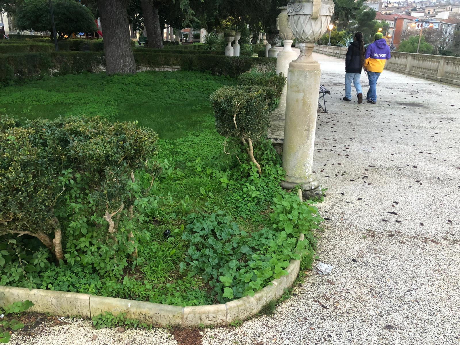 Una manutenzione sbagliata, tanti soldi spesi andati in fumo per cercare di arginare l’avanzata del punteruolo rosso e per di più lasciate così a mezzo busto, rendono questo sito, agli occhi dei visitatori, uno spettacolo indecoroso. Per di più non si intravede, oramai da mesi, una sorta di programmazione per la sostituzione di questi alberi con altre specie di piante come è stato fatto tempestivamente qualche anno fa in piazza Duomo. Ma questo è solo l’inizio. Ci imbattiamo, nei viali secondari, in siepi non rimpinguate adeguatamente e trascurate che straboccano di erbacce”. “Altri due, poi – prosegue D’Asta – i punti dolenti.
