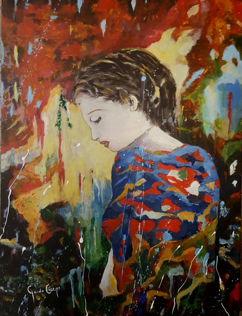 “Esser donna”, dipinta con colori acrilici su tela, è stata realizzata in occasione della scorsa giornata internazionale contro la violenza sulle donne. Ritrae una figura femminile assorta nei suoi pensieri. L’artista affida la trasposizione su tela di tali sentimenti ed emozioni ai veloci colpi di pennello, agli spruzzi di colore e alle tinte accese che “illuminano” lo sfondo scuro, aprendo un varco che consente allo spettatore di cogliere l’anima e l’essenza del soggetto rappresentato. Nel suo stile pittorico si fondono, in una sintesi originale, suggestioni del post impressionismo e dell’astrattismo, del dripping pollockiano e del realismo.