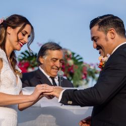Centinaia di palloncini, un arco di bouganville e rose bianche e le installazioni luminose di Domenico Pellegrino hanno reso ancora più suggestiva la spiaggia dove si è tenuta la funzione civile, officiata dal sindaco Leoluca Orlando, e le terrazze sul mare dove si è svolto party di cui ha curato i coreografici allestimenti la wedding planner Emma Bifulco.