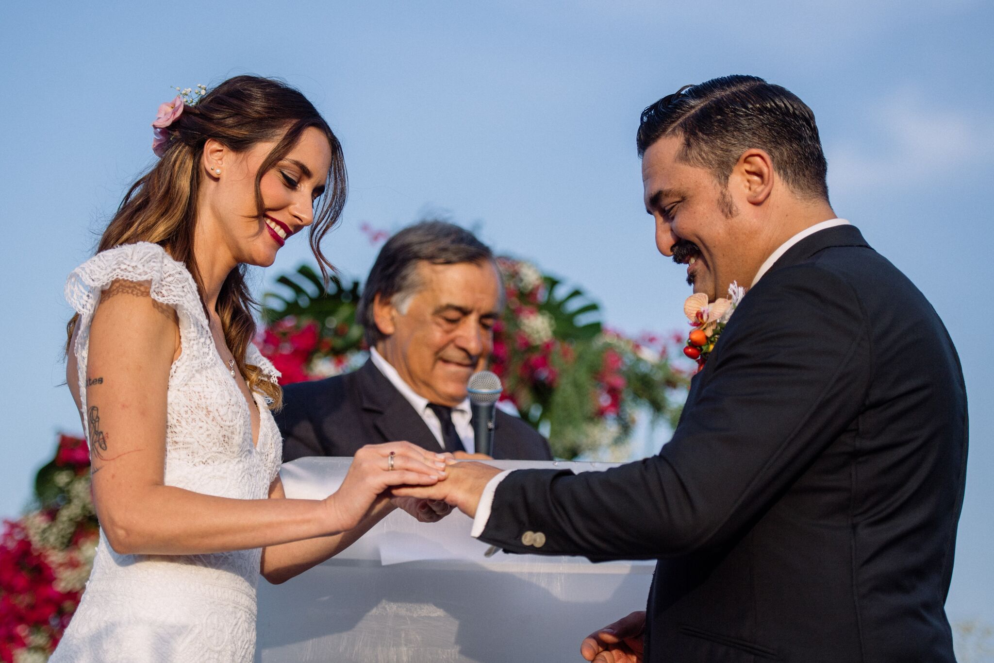 Centinaia di palloncini, un arco di bouganville e rose bianche e le installazioni luminose di Domenico Pellegrino hanno reso ancora più suggestiva la spiaggia dove si è tenuta la funzione civile, officiata dal sindaco Leoluca Orlando, e le terrazze sul mare dove si è svolto party di cui ha curato i coreografici allestimenti la wedding planner Emma Bifulco.