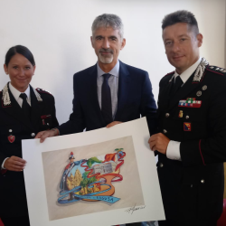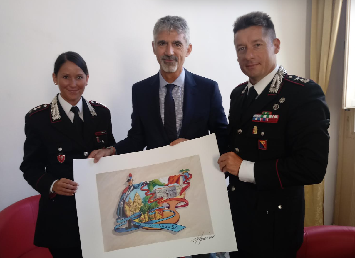 A fine incontro il Tenente colonnello Federico Reginato ha donato al sindaco Giuseppe Cassi in ricordo della visita al Comando provinciale, una litografia a colori che riproduce un carabiniere in alta uniforme chi tiene in mano il tricolore sotto il quale sono riprodotti i prospetti della sede del Comando provinciale di Ragusa e del Duomo di San Giorgio di Ibla.