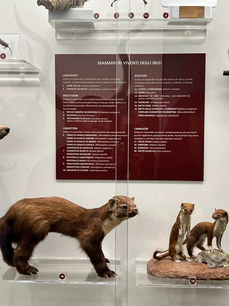 La mostra rappresenta un’estensione della Sezione Zoologica del Museo, concentrandosi sui vertebrati, in particolare sui mammiferi siciliani e sulle specie presenti nell’area Iblea. Dagli ambienti collinari fino al mare, la mostra esplora la varietà di creature che popolano questa regione, compresa la Foca monaca, una specie un tempo diffusa lungo le coste locali, di cui il museo conserva un esemplare datato alla fine del 1800.