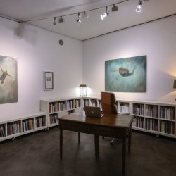 Si continua con una lunga galleria di pitture di Federica Gisana, in cui il mondo sospeso di paracadutisti, e i frammenti di colori in caduta libera, strutturano tele di forte impatto plastico e cromatico.