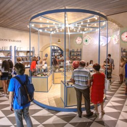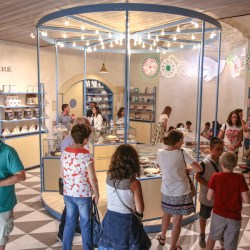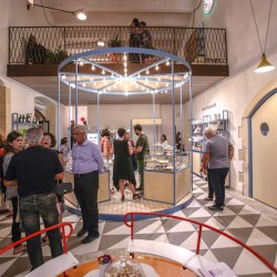 La raffinata bottega propone i cioccolati di Sabadì, le essenze della Casa del tè, l’Olio dei Fratelli Aprile di Scicli, le farine e le paste di La Timpa, ma anche i libri di Sime Book, fedele immagine dei colori della Sicilia.