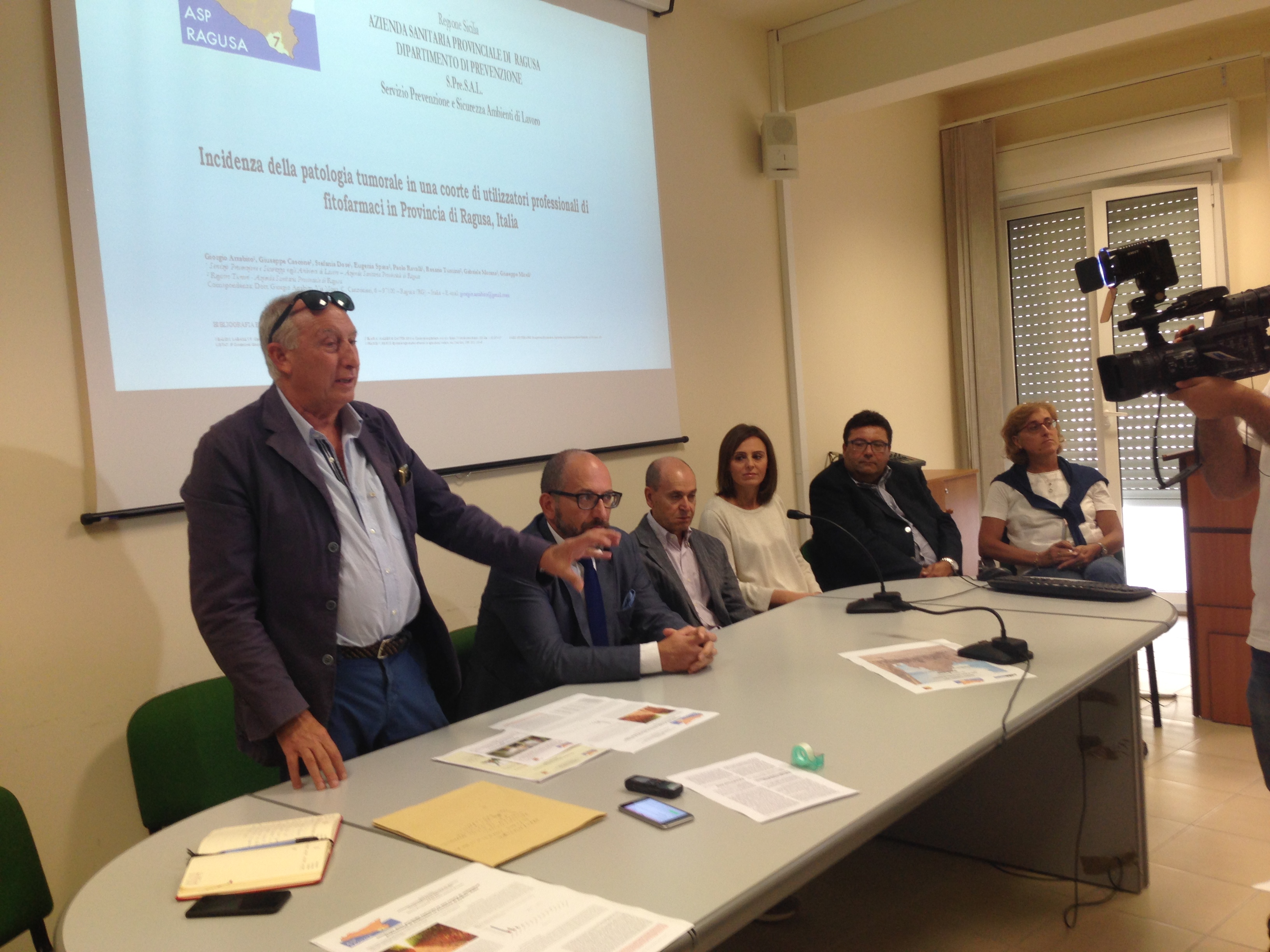 Ragusa – In un’affollata conferenza stampa, che si è tenuta presso la sala conferenze del Dipartimento di Prevenzione, alla presenza del Capo Dipartimento, dr. Francesco Blangiardi, i dirigenti medici dello S.Pre.S.A.L. – Servizio Prevenzione e Sicurezza Ambienti di lavoro: Giuseppe Miceli, Paolo Ravalli, Giorgio Arrabito e Stefania Dore hanno presentato un importante studio su: *“Incidenza della patologia tumorale in una coorte di utilizzatori professionali di fitofarmaci in Provincia di Ragusa, Italia.”*