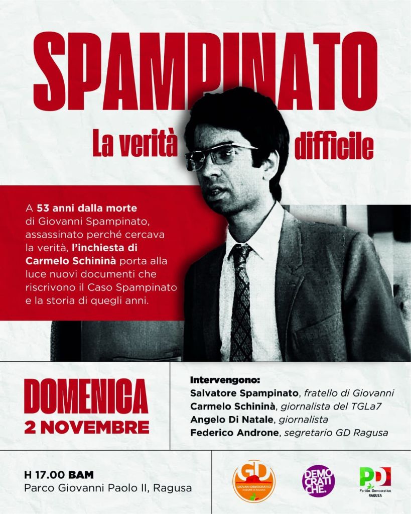 Domenica 2 novembre, i giovani del Partito Democratico – Circolo Giovani Democratici di Ragusa promuovono un incontro pubblico in memoria di Giovanni Spampinato, nel giorno in cui ricorre il 53° anniversario del suo assassinio. L’evento prevede gli interventi dei giornalisti Carmelo Schininà e Angelo Di Natale, e la partecipazione del fratello della vittima, Salvatore Spampinato, che porterà il ricordo personale e familiare di un sacrificio ancora troppo poco chiarito.