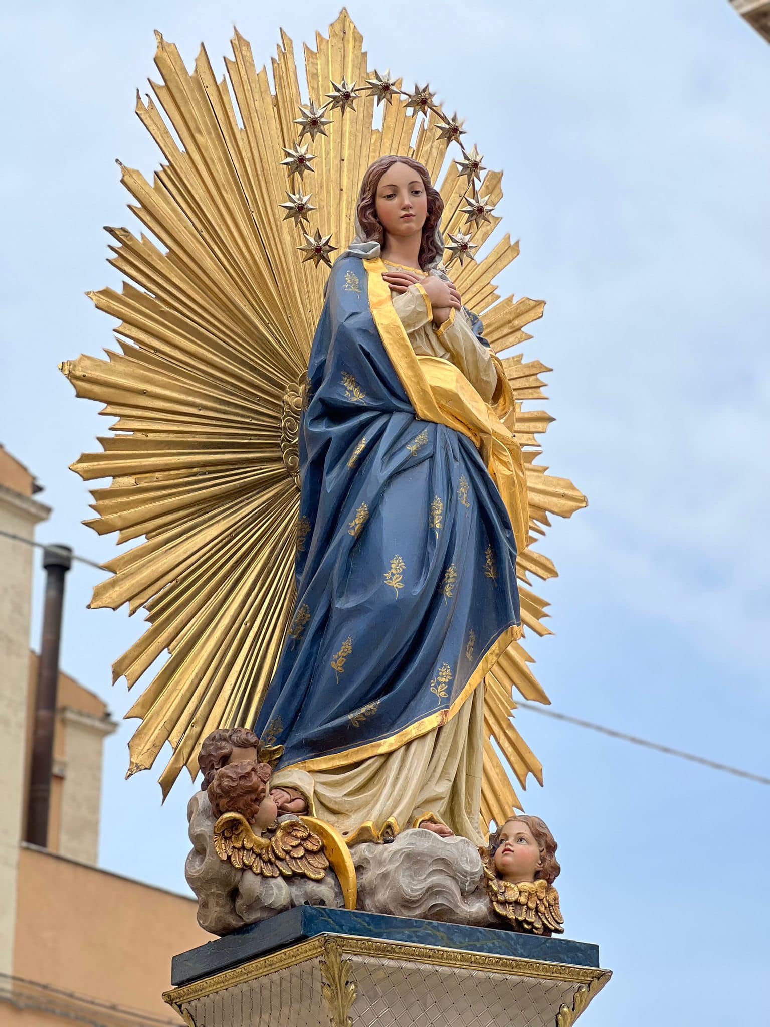 La novità è che sarà portato in processione, a differenza del passato, il meraviglioso simulacro della Vergine realizzato agli inizi del ‘900 (Ortisei – 1954) in sostituzione di quello settecentesco. I frati minori conventuali, infatti, già negli anni ’50 del secolo scorso, avevano predisposto la nuova statua con un magnifico piedistallo ligneo in funzione delle processioni esterne avvenute solamente due o tre volte in quel periodo. Oggi la venerata effigie della ‘Bella Madre’ ritorna al suo originario splendore, risistemata e riadattata, grazie alla sollecitudine dei parrocchiani e dei devoti e grazie soprattutto alle generose elargizioni dei benefattori e del lavoro artigianale che alcuni di essi hanno svolto.