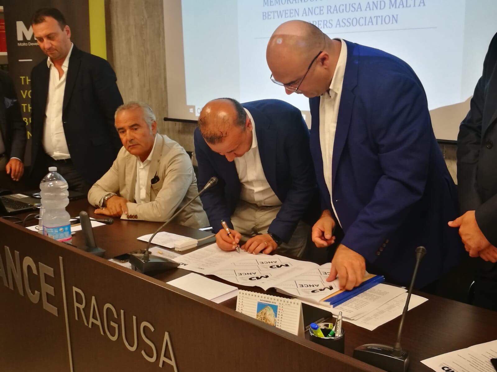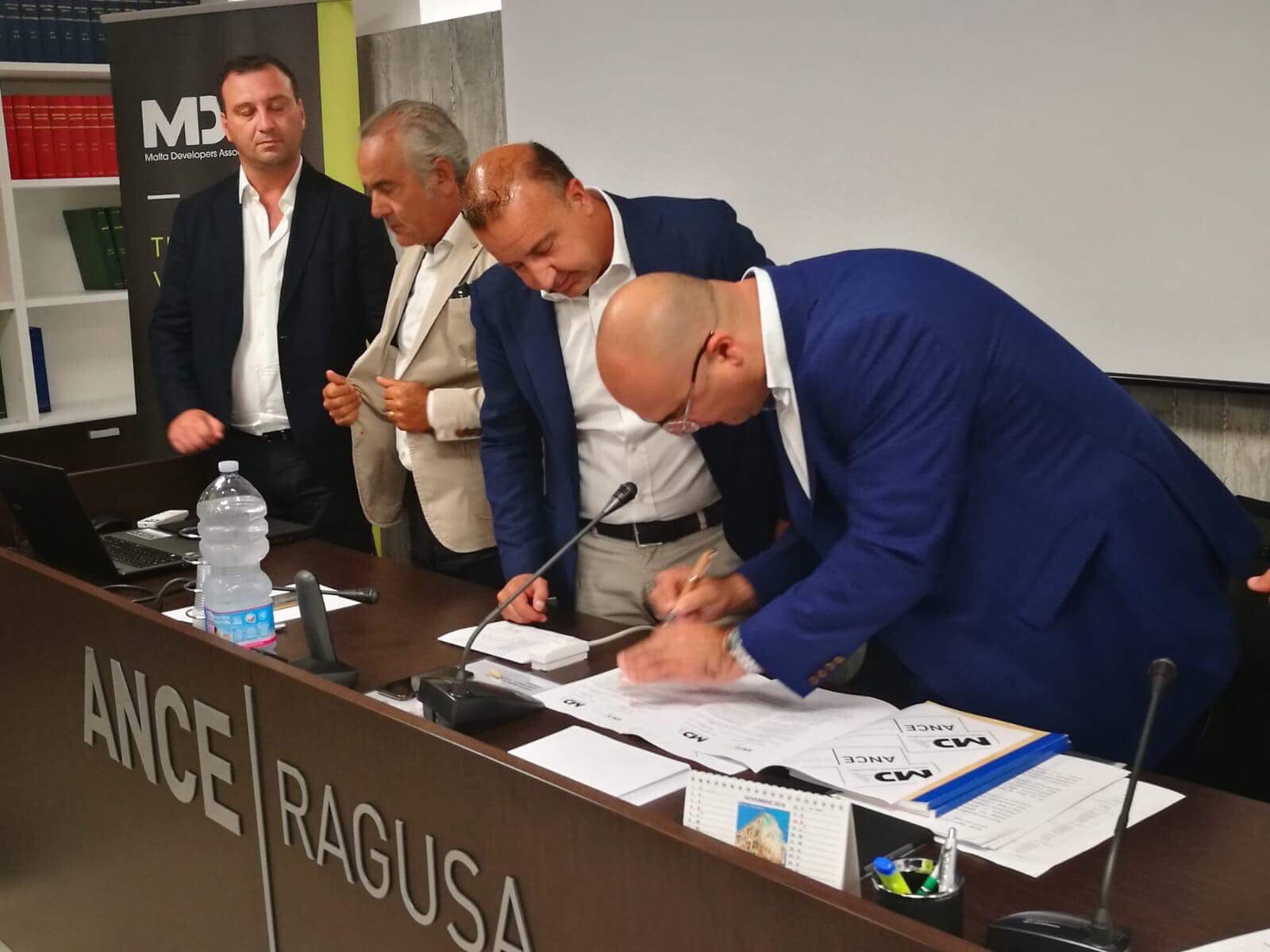 Firmato ieri, 31 agosto 2018 presso la sede di Viale dei Platani a Ragusa, il Protocollo d’Intesa (Memorandum) tra i Costruttori Iblei di ANCE e i colleghi maltesi di MDA (Malta Developers Association). “Poniamo grandi aspettative da questa collaborazione vocata allo sviluppo ed al lavoro e che si pone l’obiettivo di creare occasioni ed opportunità di business attraverso la rete che oggi mettiamo a fattor comune. Desideriamo ringraziare i nostri Onorevoli regionali, Stefania Campo e Orazio Ragusa (l’Onorevole Marialucia Lorefice, Presidente della Commissione per gli Affari Sociali della Camera, data la sua impossibilità ad intervenire, ha fatto pervenire una nota di saluto che è stata molto apprezzata da tutti gli intervenuti) il Sindaco di Ragusa, Peppe Cassì, ed il suo Assessore, Giovanni Giuffrida, il Sindaco di Chiaramonte, Sebastiano Gurrieri, l’Assessore ai Lavori Pubblici del Comune di Pozzallo, Rosario Agosta, il Presidente di Sicindustria sede di Ragusa, Leonardo Licitra, il Presidente di Sicilesco, Marco Anfuso, che hanno partecipato all’evento e che, con i loro interventi, hanno conferito alla cerimonia il valore aggiunto della rappresentanza delle Istituzioni pubbliche e private. Di particolare interesse la relazione del Presidente di MDA, Sandro Chetcuti, che ha presentato dati, prospettive ed idee di investimento nel nostro territorio e le opportunità oggi presenti nell’Isola dei Cavalieri; di taglio prettamente Istituzionale, invece, quello dell’Onorevole Segretario di Stato Clifton Grima che ha portato i saluti del Governo maltese e l’altro, squisitamente tecnico del Presidente dell’Autorità di Pianificazione maltese, Johann Buttigieg, che ha parlato di velocità delle decisioni, di burocrazia snella e di sostegno ai progetti di investimento a Malta. I lavori, prima della cerimonia della firma, sono stati chiusi del Presidente dei Giovani Imprenditori di ANCE Ragusa, Alessandro Taranto, che è stata la vera testa d’ariete ed il promotore della partnership ibleo-maltese.”