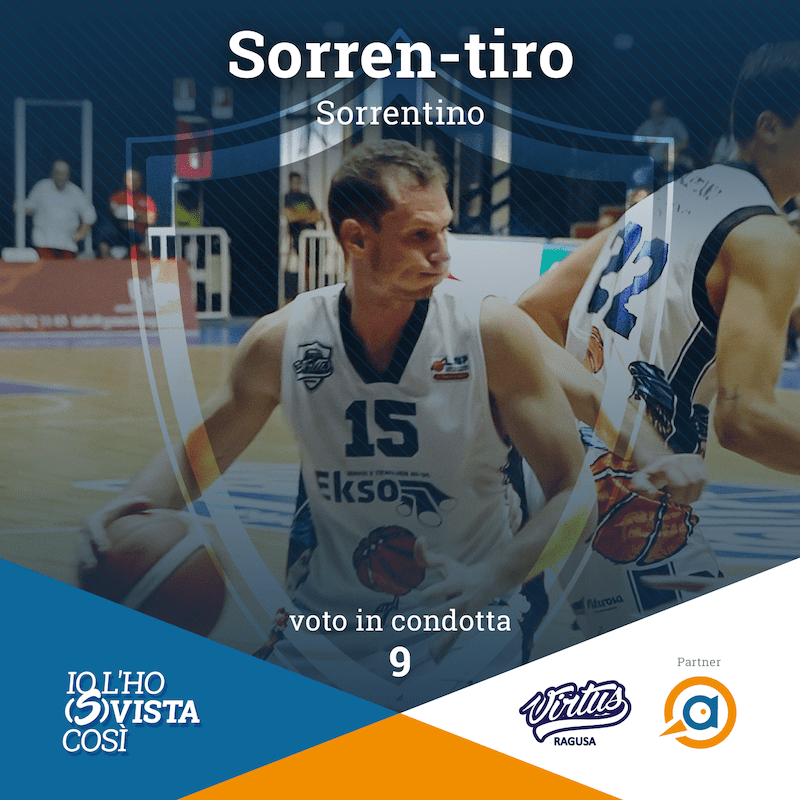 Altro protagonista di giornata è stato Sorren-tiro! Tira da dove tirano gli umani e procura il break decisivo dopo che la difesa colabrodo Virtussina, aveva permesso ai Monfalconesi, di rientrare da meno dieci e pareggiare fino ad allungare di un piccolo passo. Nell’ultima partita di coppa Italia si era esibito dal bar e da Piazza della Libertà, oggi è rimasto in palestra e perciò più preciso. Qualche inciampo nei tiri liberi… troppo vicino al ferro del canestro.Pagella: condotta 9