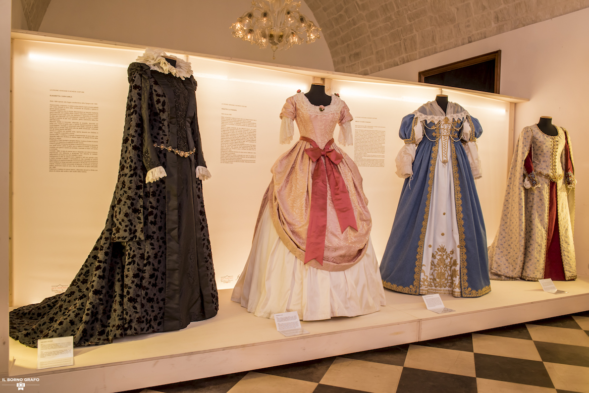 La mostra racconta molti di questi amori e di queste passioni, con allestimenti e costumi di alcune delle rappresentazioni melodrammatiche messe in scena dai tre grandi teatri italiani con cui è stata attivata la collaborazione in occasione di questo evento che trasforma il piccolo Teatro Donnafugata in uno scrigno tutto da scoprire.
