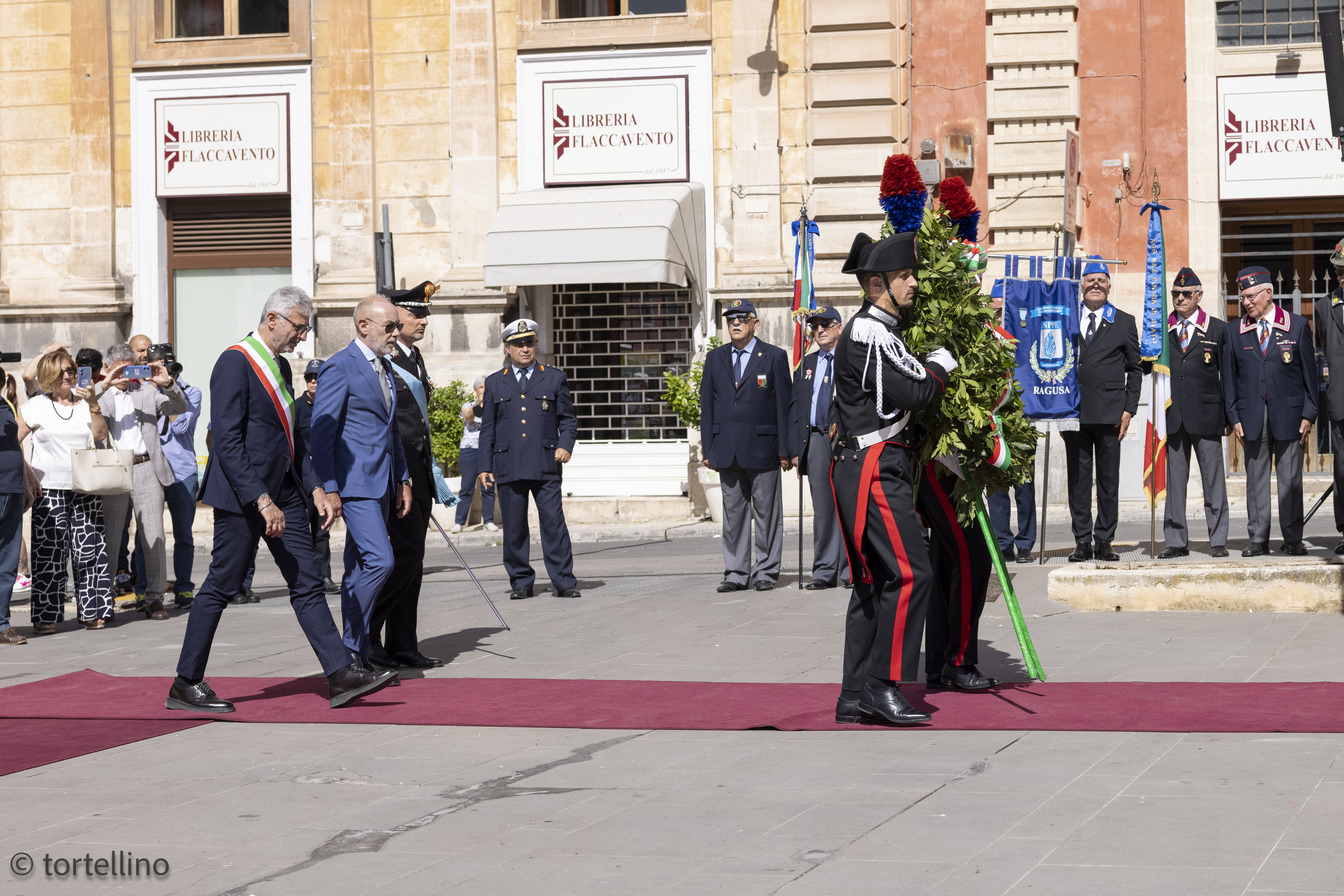 Dopo il tradizionale momento dell’Alzabandiera, innanzi allo schieramento del Picchetto interforze e dei Gonfaloni dei Comuni della provincia, il Prefetto Giuseppe Ranieri, accompagnato dal Comandante di Presidio Col. Gabriele Gainelli e dal Sindaco di Ragusa Giuseppe Cassì, ha proceduto alla deposizione di una corona di alloro davanti al monumento ai Caduti.