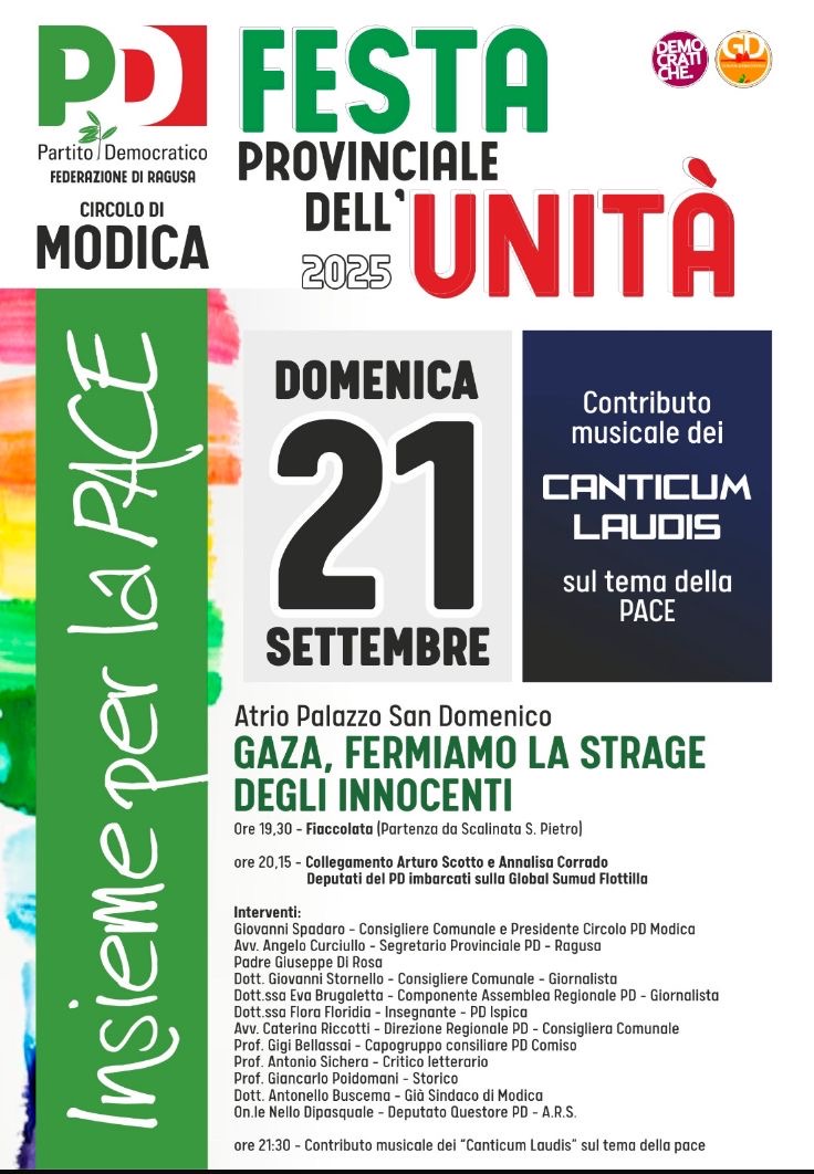 Oggi a Modica , a distanza di moltissimi anni dall’ultima edizione, Modica tornerà ad ospitare la *Festa dell’Unità*, appuntamento storico e identitario del Partito Democratico, che quest’anno si terrà nell’*Atrio di Palazzo San Domenico* con il titolo: