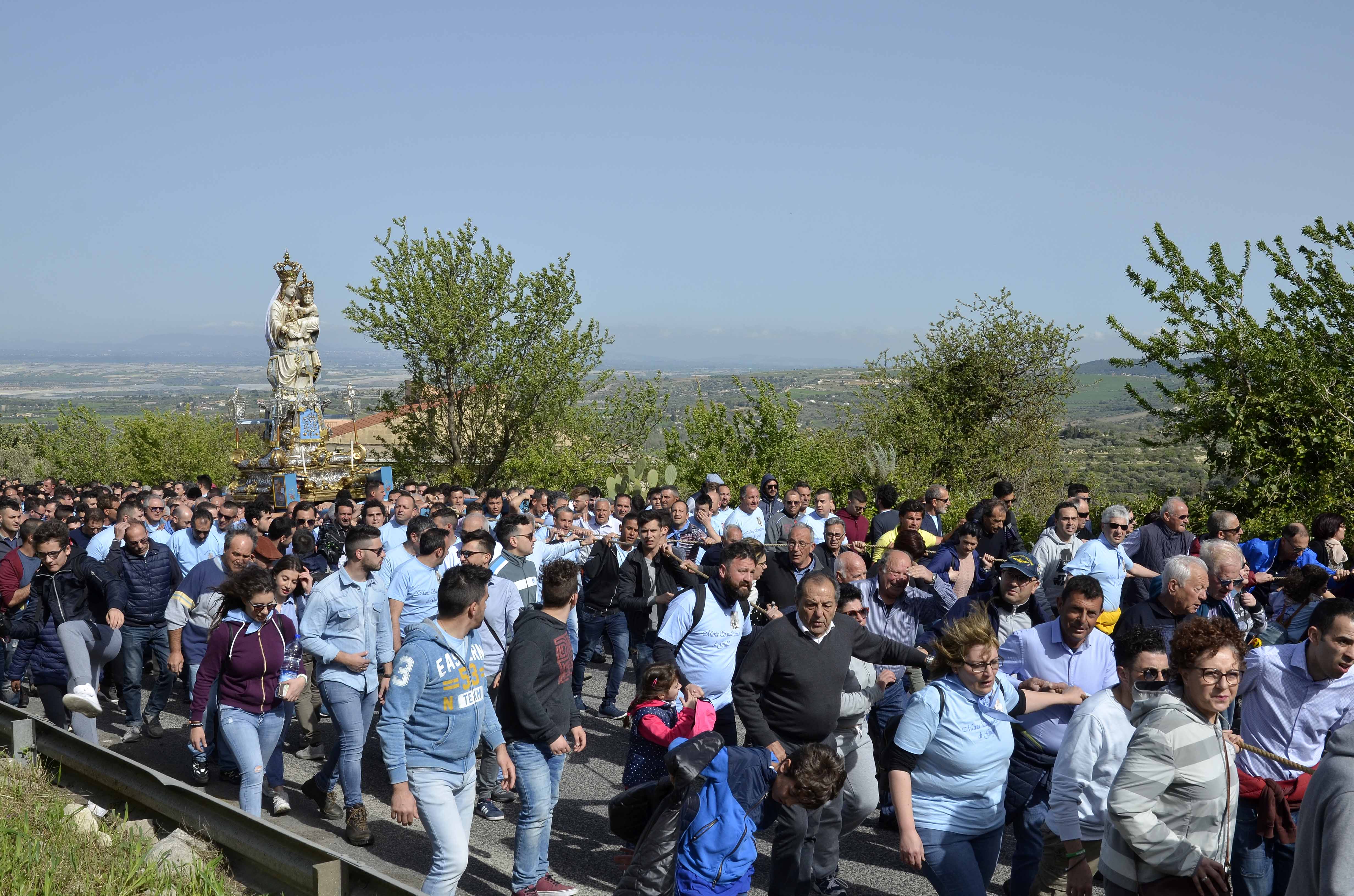 Sono di quelle emozioni che quasi non si possono raccontare. Solo vivendole, trovandocisi in mezzo, è possibile percepire l’affetto profondo e la devozione che i chiaramontani nutrono per la propria Regina e Patrona. E’ la giornata in cui un territorio manifesta nel profondo, al di là degli aspetti prettamente religiosi, la propria identità. Anche questa mattina tutti di corsa a ringraziare Maria Santissima di Gulfi. Un modo unico di esprimere un attaccamento che dura da secoli e che, ogni anno, si rinnova con trepidazione. Dal santuario di Gulfi sino ad arrivare in piazza Duomo, fedeli a migliaia. Una lunga teoria di devoti ha animato, senza soluzione di continuità, un percorso lungo quattro chilometri. E’ la corporeità della fede. Che si traduce nel celebrato atto della “salita”, l’“accianata” per dirla in dialetto. Ma è, soprattutto, la passione di un popolo, quello che si riconosce nella propria Madre. La festa più attesa del centro montano non ha tradito le attese. Nonostante le condizioni climatiche non proprio favorevoli, contrassegnate da un fastidioso vento. La tradizionale “Salita della Madonna” è stata caratterizzata, sin dalle prime ore del mattino, dal pellegrinaggio verso il santuario di Gulfi. Poi, dopo la concelebrazione presieduta dal nuovo rettore del Santuario, padre Graziano Martorana, è stato dato il via, alle dieci in punto, al momento più coinvolgente. Lungo i tornanti della strada provinciale n.7, che collega il santuario a piazza Duomo, i portatori a fare da battistrada, preceduti dai componenti della banda musicale Vito Cutello ad intonare l’immancabile “N. 11”, la processione si è mossa, come sempre, con una velocità che non conosce paragoni rispetto ad altre manifestazioni religiose analoghe presenti nel circondario diocesano. Tutti si sono dati da fare grazie all’utilizzo delle apposite corde. Dagli uomini di Chiesa ai rappresentanti delle forze dell’ordine, dalla gente più semplice a studiosi di fama e imprenditori affermati. Non c’è stata distinzione. Tutti accomunati dal grido “Viva Maria”. Alternando tratti di corsa ad altri con passo comunque spedito, il simulacro, come succede sempre, ha raggiunto piazza Duomo nel giro di un’ora, alle undici in punto. C’è stato il tempo, però, e anche in questo caso la tradizione è stata rispettata, per una sosta, all’ingresso di Chiaramonte, in cui i portatori e alcuni fedeli si sono rifocillati recuperando le energie grazie ad alcuni limoni mentre altri intonavano il “Tota pulchra”. Poi il panorama del paesaggio si è modificato e alla campagna chiaramontana, caratterizzante il primo tratto della processione, sono subentrate le viuzze caratteristiche della via Gulfi con la lunga processione insinuatasi nel cuore del centro montano alla stregua di un lungo serpentone. Un’emozione sempre nuova, per giovani e anziani, gli stessi che hanno dato vita ai momenti distintivi della salita. Il predicatore, frate Alfio Lanfranco, ofm, ha accolto la processione, ricca di numerose suggestioni, all’ingresso trionfale in piazza Duomo dove, al momento dell’arrivo del simulacro, la folla presente ha fatto partire un lungo, sentito e scrosciante applauso. Quindi, i portatori, noncuranti della fatica, hanno fatto sì che la tradizione venisse ulteriormente rispettata con le numerose entrate e uscite del simulacro dalla navata centrale dell’edificio di culto. E ad ogni uscita il convinto applauso dei fedeli in una piazza stracolma a volere ringraziare l’attenzione che la Madonna di Gulfi riserva, ogni anno, alla città. Presente alla manifestazione anche il sindaco Sebastiano Gurrieri e i componenti della squadra assessoriale. Le celebrazioni sono proseguite alle 14,30 con il tradizionale “cuncursu” per le vie cittadine, vale a dire la processione pomeridiana. Alle 17,45 un altro momento atteso con il simulacro del Patrono San Vito portato in Chiesa madre. Alle 19, la celebrazione eucaristica che sarà presieduta dal predicatore. Domani, invece, il programma dei solenni festeggiamenti prosegue con la cosiddetta “Giornata dei trappitari”. Alle 9 la prima celebrazione eucaristica. La santa messa delle 11 sarà presieduta da don Marco Diara, parroco del Sacro Cuore di Gesù a Ragusa. La messa è animata dall’ordine secolare francescano e dall’ordine secolare carmelitano. I canti sono animati dalla comunità della chiesa di Santa Maria del Gesù. Alle 19 la celebrazione eucaristica presieduta dal predicatore. Alle 20,30 ci sarà la degustazione dell’olio a cura dei trappitari. Ad allietare la serata il gruppo “Musica e magia” di Damiano Scollo.