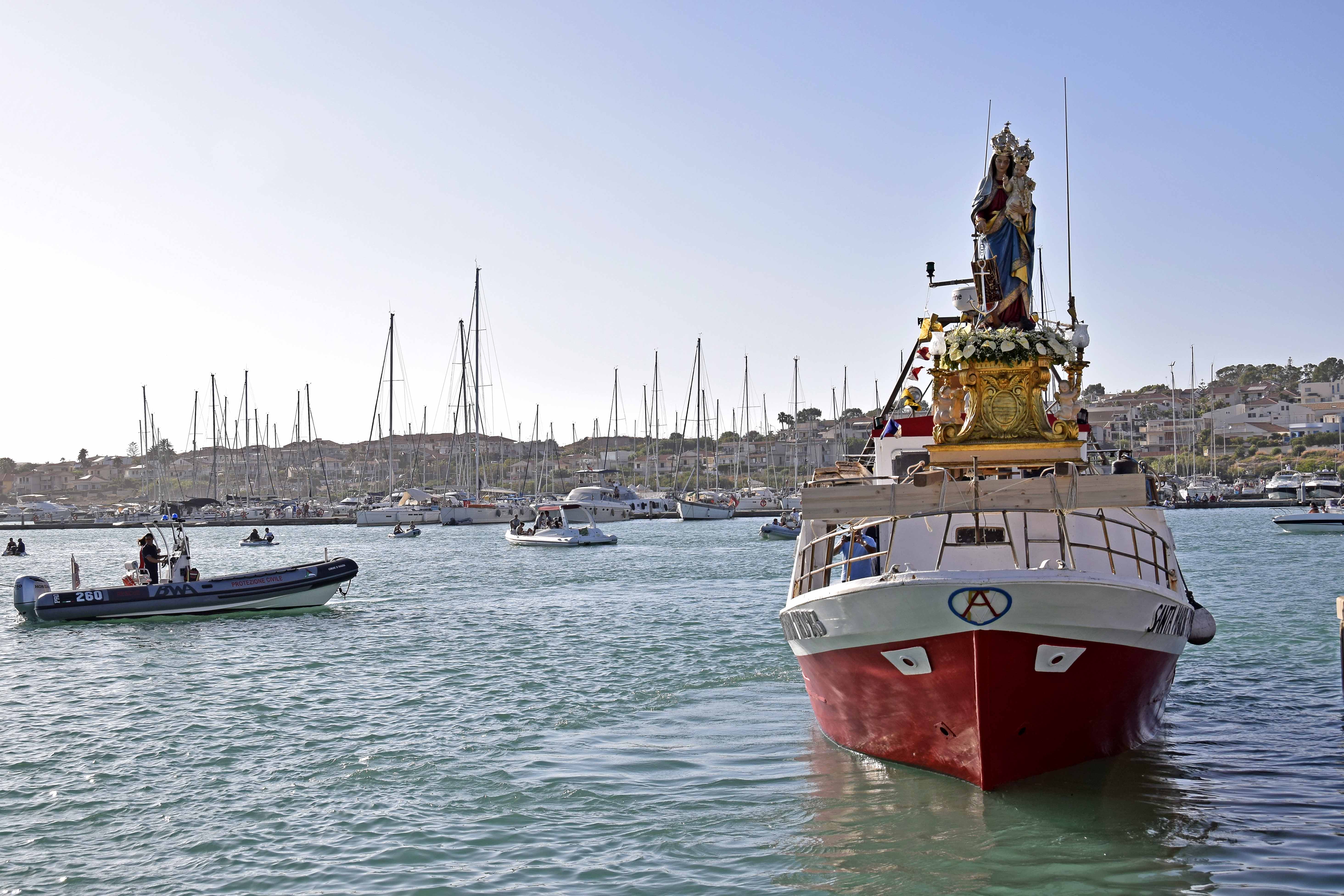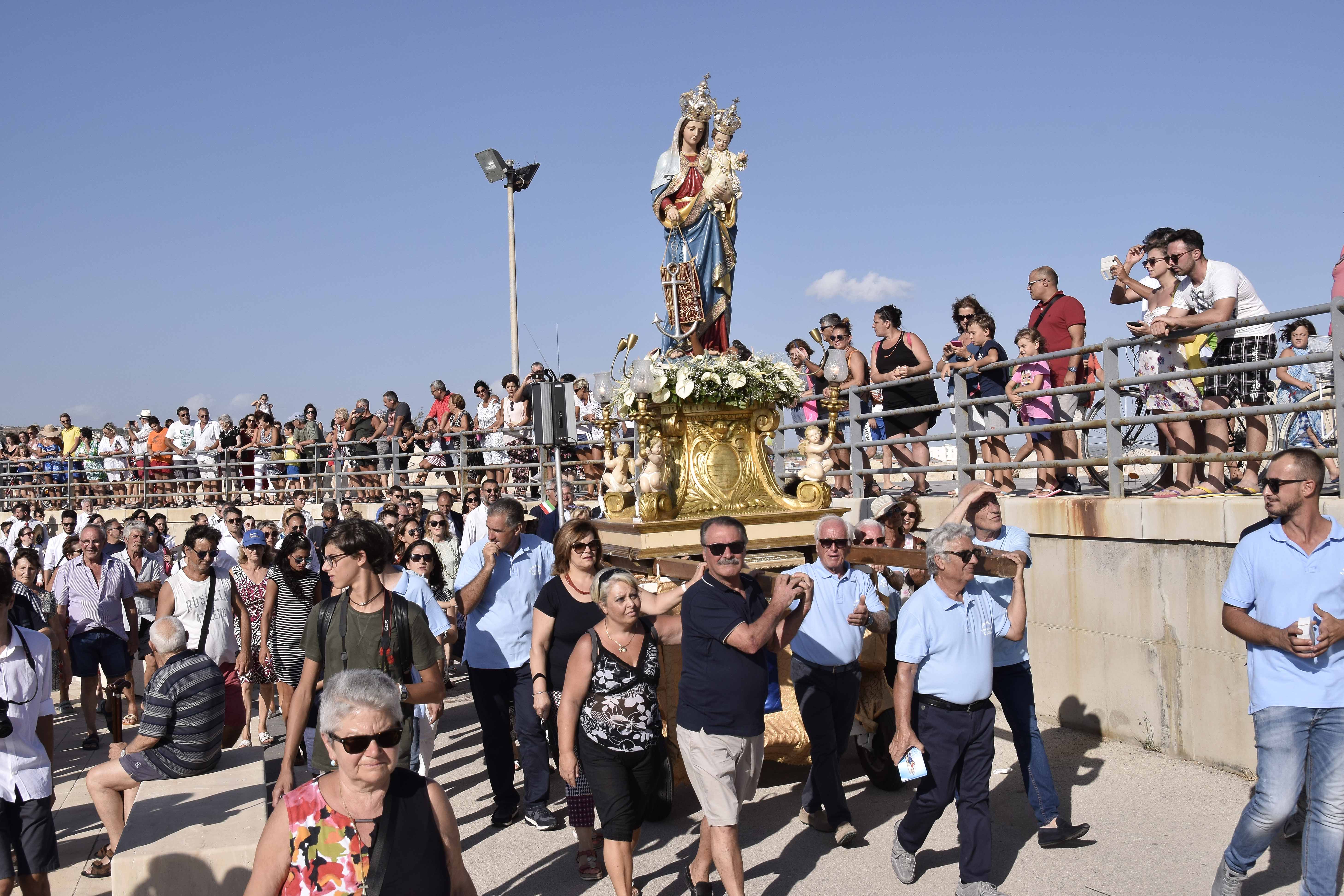 La processione è stata accompagnata dal corpo bandistico Vito Cutello di Chiaramonte Gulfi che già in mattinata aveva animato il risveglio musicale con il giro per alcune vie cittadine. A garantire l’ordine pubblico c’erano i carabinieri della locale Stazione, la polizia di Stato e gli agenti della polizia locale. Subito dopo l’imbarco, il parroco, don Riccardo Bocchieri, ha letto la benedizione al mare. “Noi ti benediciamo e ti rendiamo grazie – ha declamato tra l’altro il sacerdote – Dio di provvidenza infinita, per i grandi segni del tuo amore profusi nel corso dei secoli sulle generazioni umane che hanno solcato le vie del mare. Per tua grazia, Signore, i nostri padri, che ci trasmisero i segreti del navigare, ci hanno insegnato a vedere nell’immensità delle acque le orme della tua presenza; e con gli strumenti di quella difficile arte ci hanno consegnato la bussola della fede e il timone della speranza”.