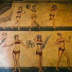 “Strophium e subligar sono i due pezzi che identificano il bikini romano e la Villa del Casale di Piazza Armerina è famosa nel mondo fin dal giorno della sua apertura, nel 1954, proprio perché il New York Times rivelò al mondo che il costume due pezzi non era un’invenzione francese, bensì l’abbigliamento ginnico tipico delle palestrite dell’antica Roma”, ritratte in un mosaico con indosso un due pezzi che lasciava scoperte spalle, gambe e soprattutto pancia e ombelico.