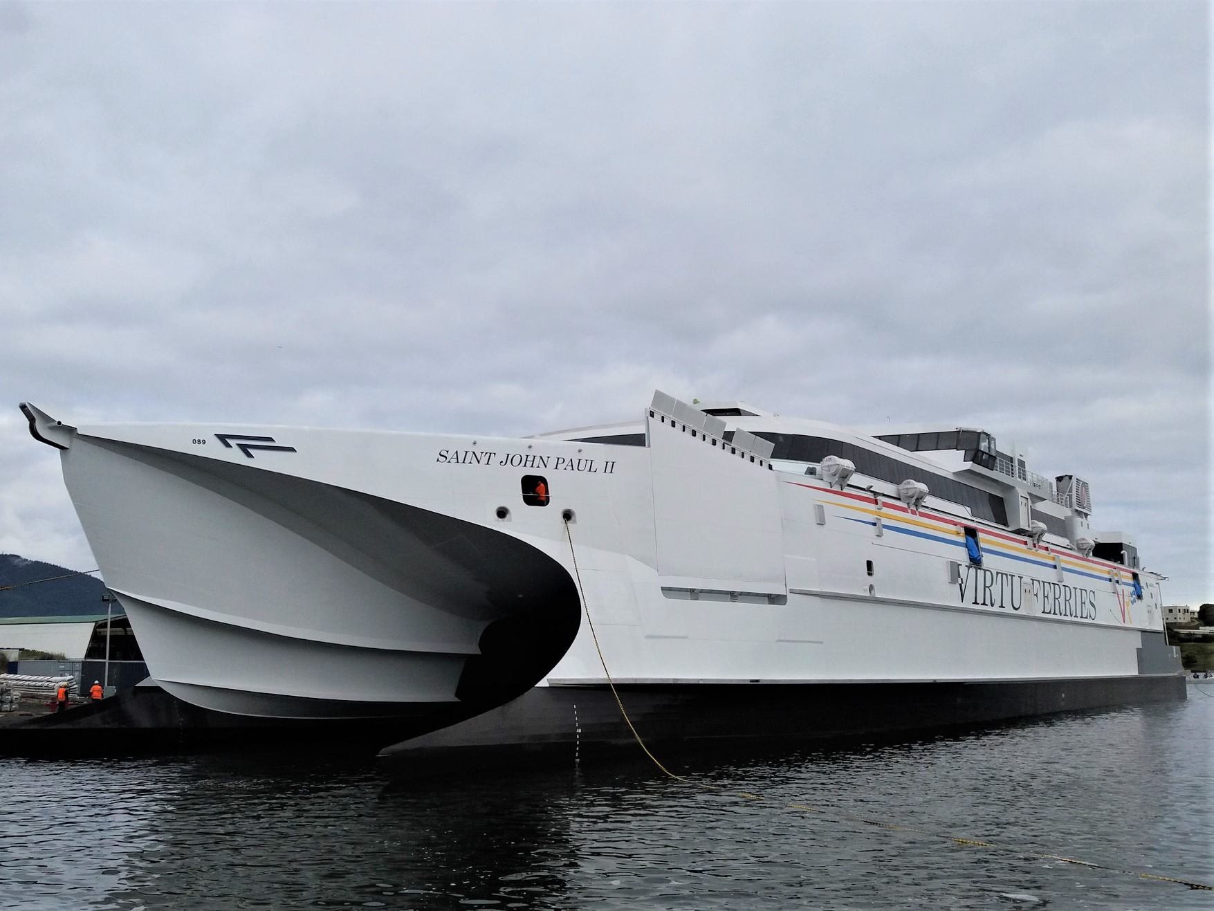 Con una stazza lorda di 1000 tonnellate, una capacità di 900 passeggeri in 5 sale e un garage capiente per 167 auto o 23 rimorchi, il catamarano Saint John Paul II sarà il più grande catamarano ad alta velocità Ro-Pax che opererà nel Mediterraneo e il secondo più grande al mondo.