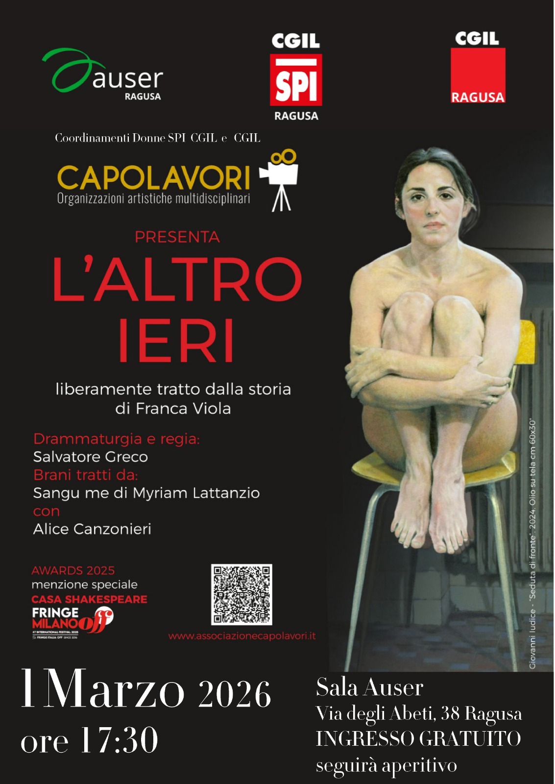 Un pomeriggio di memoria, coscienza e impegno civile. Domenica 1 marzo 2026, alle ore 17.30, la Sala Auser di via degli Abeti 38 a Ragusa ospiterà “L’Altro Ieri”, spettacolo liberamente tratto dalla storia di Franca Viola, simbolo di emancipazione e di riscatto femminile nella Sicilia del Novecento. L’iniziativa è promossa dai Coordinamenti Donne SPI CGIL e CGIL di Ragusa e dall’Auser Ragusa, nell’ambito del progetto “Capolavori – Organizzazioni artistiche multidisciplinari”, a conferma di un percorso culturale che intreccia arte e diritti, memoria e attualità. Con drammaturgia e regia di Salvatore Greco, e con Alice Canzonieri in scena, lo spettacolo si avvale di brani tratti da “Sangu me” di Myriam Lattanzio. Un lavoro intenso, capace di restituire non soltanto la cronaca di una vicenda che ha segnato la storia giuridica e sociale del Paese, ma soprattutto la forza silenziosa di una donna che, opponendosi al cosiddetto “matrimonio riparatore”, scardinò un sistema di sopraffazione radicato e legittimato. Non è solo teatro. È una chiamata collettiva alla responsabilità. È il racconto di un “altro ieri” che continua a interrogarci sull’oggi. “Abbiamo scelto di proporre questo spettacolo,dichiara Cecilia Tumino, responsabile del Coordinamento Donne SPI CGIL Ragusa, perché la storia di Franca Viola non appartiene soltanto al passato. È una ferita che si è trasformata in svolta storica. Raccontarla oggi significa ribadire che i diritti delle donne non sono mai definitivamente acquisiti, ma vanno custoditi, difesi, tramandati. Attraverso il linguaggio del teatro vogliamo parlare alle coscienze, soprattutto alle nuove generazioni, affinché comprendano quanto coraggio sia stato necessario per aprire strade che oggi sembrano scontate”. Sulla stessa linea l’intervento di Tiziana Celiberti, segretaria confederale CGIL Ragusa: “La CGIL considera la cultura uno strumento fondamentale di emancipazione. Eventi come questo dimostrano che l’azione sindacale non si esaurisce nei luoghi di lavoro, ma si estende alla costruzione di una società più giusta, inclusiva e consapevole. La storia di Franca Viola è una pagina di libertà scritta controcorrente. Portarla in scena significa rinnovare un impegno: contrastare ogni forma di violenza e discriminazione, promuovendo una cultura del rispetto e dell’uguaglianza”. “L’Altro Ieri” ha già ricevuto nel 2025 una menzione speciale “Casa Shakespeare” al Milano Off – Fringe Festival, riconoscimento che ne attesta la qualità artistica e la forza narrativa.