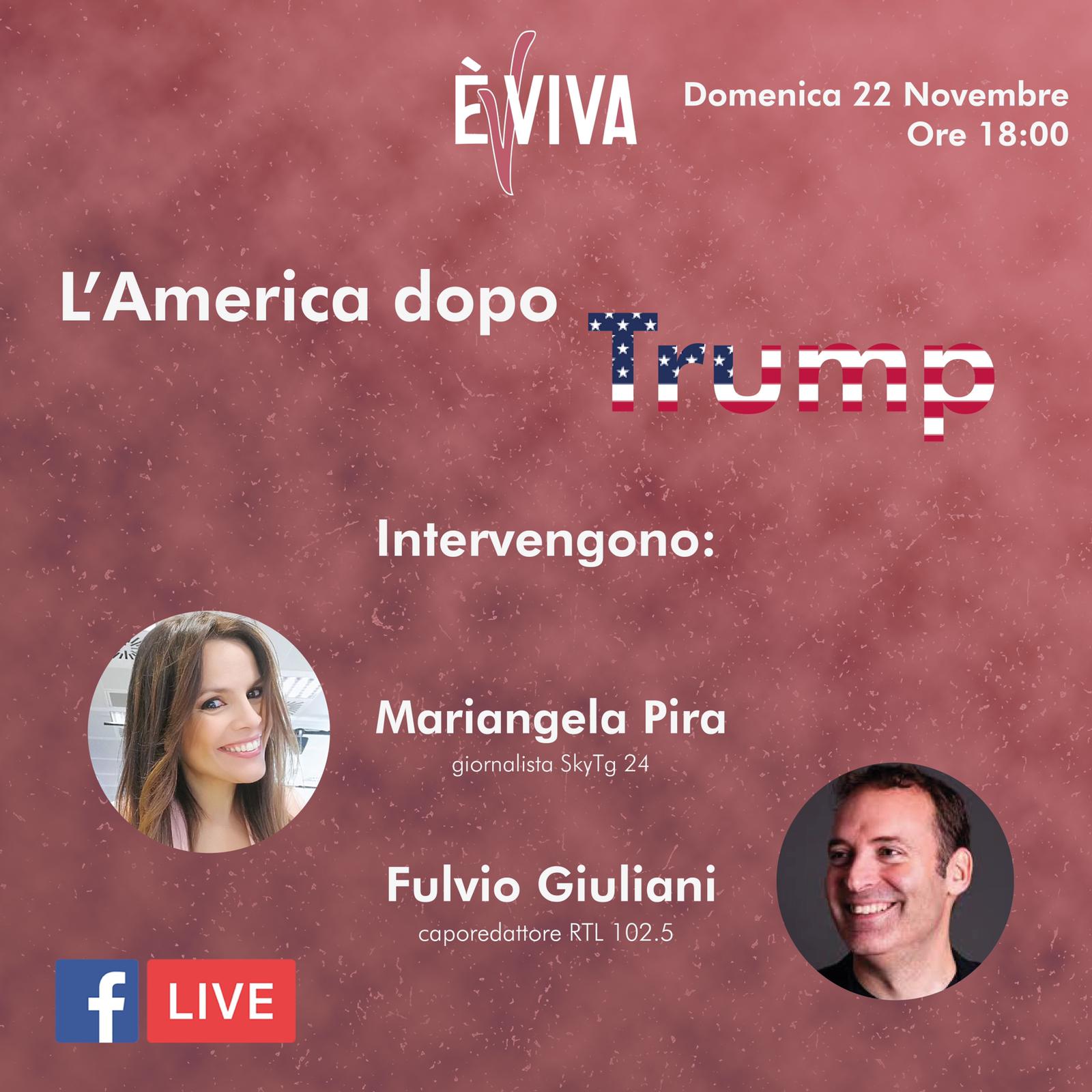 L’Associazione ha il piacere di invitare la cittadinanza a partecipare attivamente, domenica 22 novembre alle ore 18, alla propria diretta Facebook dal titolo “L’America dopo Trump” dove interverranno Mariangela Pira, giornalista e reporter di SkyTg24 e Fulvio Giuliani, giornalista e caporedattore di RTL 102.5.