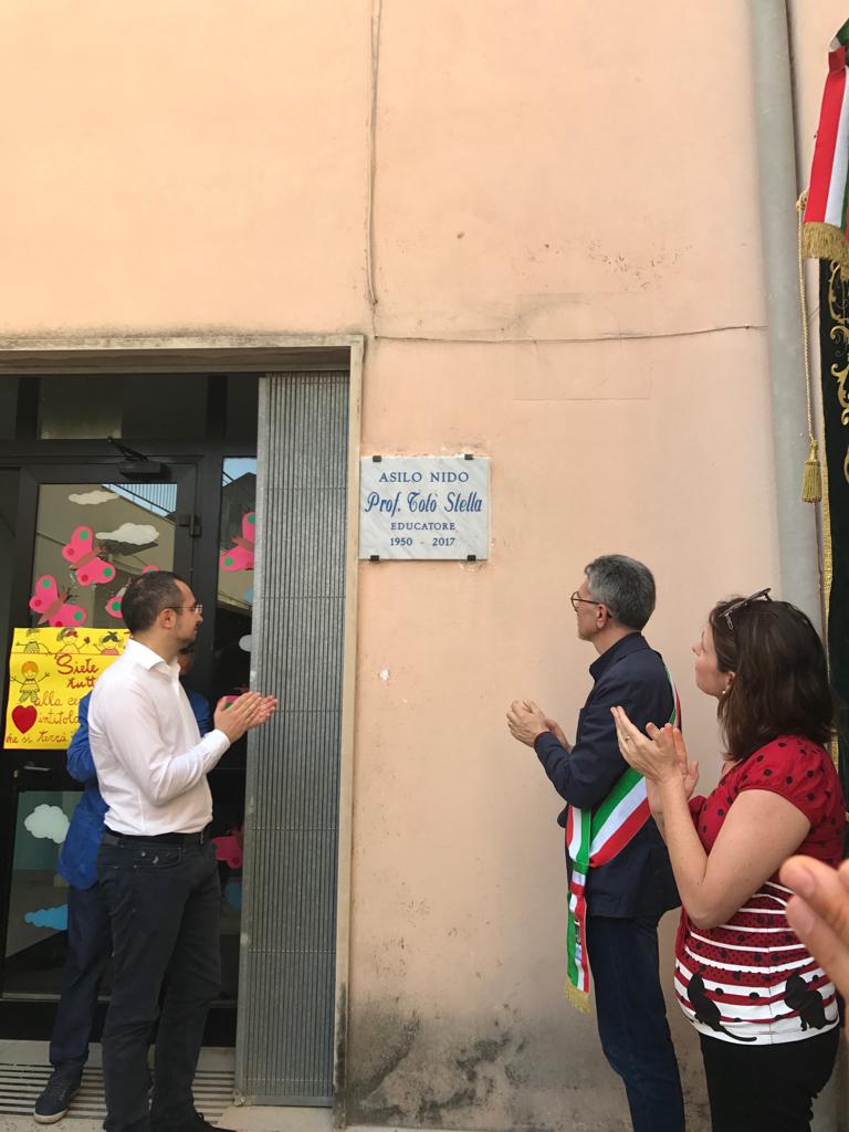 A scoprire la targa con la quale è stato intitolato l’asilo nido al prof. Totò Stella (educatore 1950-2017) è stato l’assessore alla pubblica istruzione e sviluppo di comunità, Giovanni Iacono.
